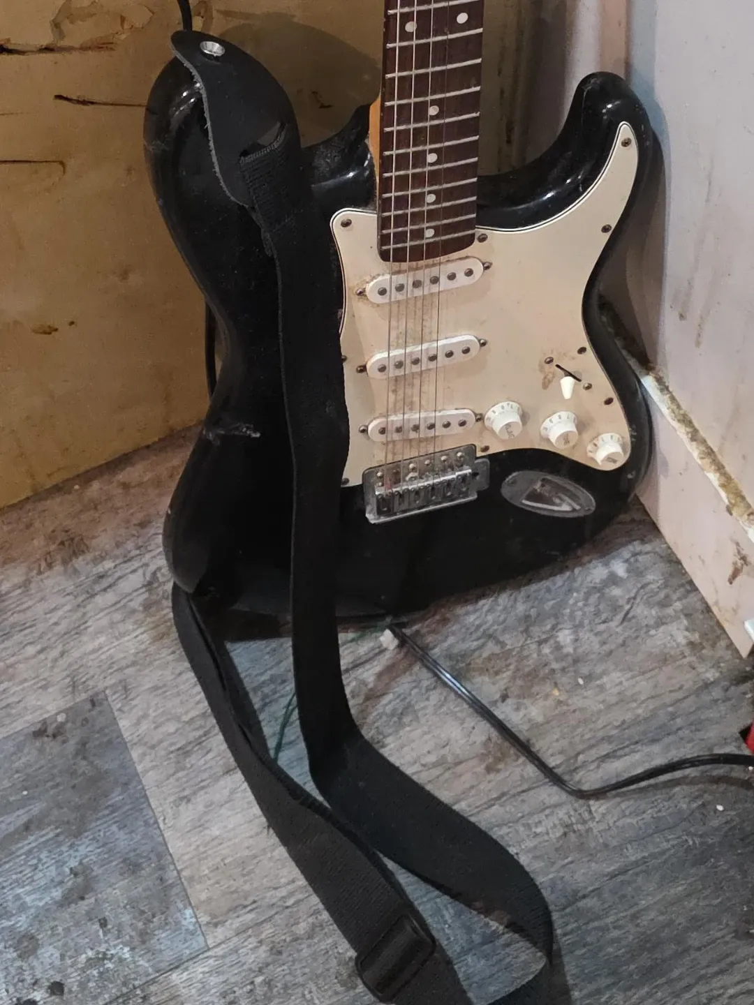 Selling a black electric guitar. It's in used condition and comes with a strap. Feel free to message with any questions!