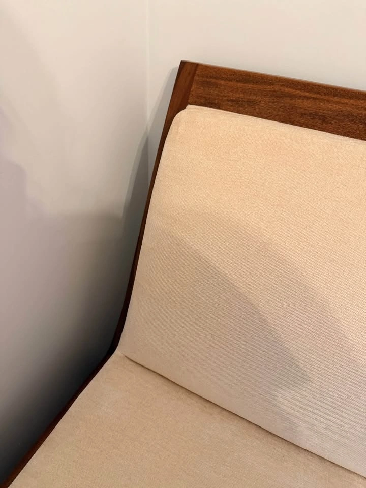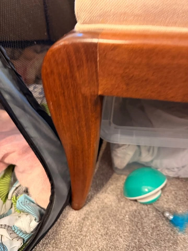 *** first photo is most accurate to the colour (lights in this room are very warm).Purchased from a staging company, original price was 600$. Had for a few months but it does not fit in my space. No snags of tears in fabric. A few small dings, some have been touched up.