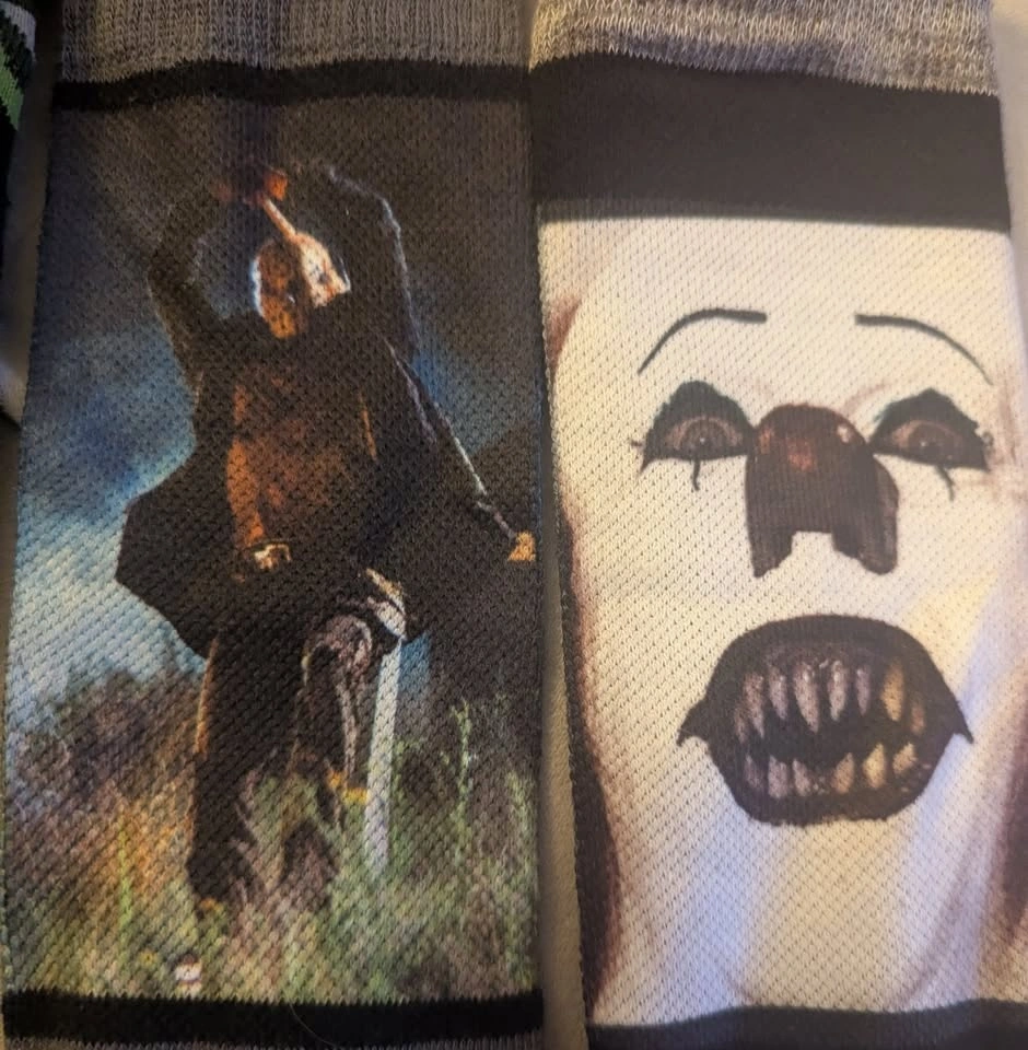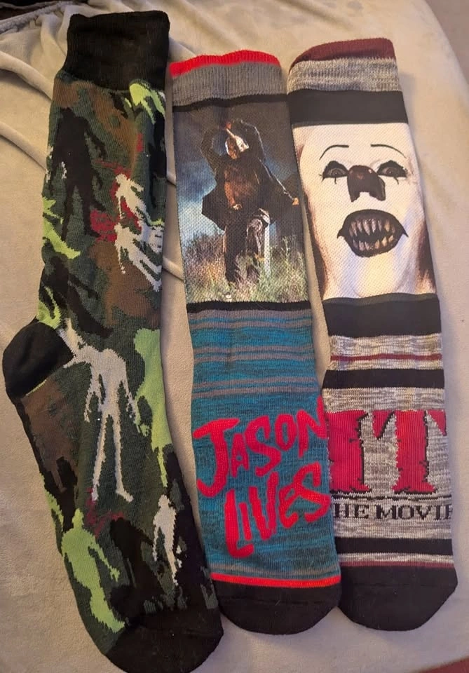 This is a collection of assorted Horror Icon socks featuring Pennywise from Stephen King's It, Jason from Friday the 13th, and a Zombies print. Happy to separate or combine with any of the other listings of socks and clothes that I've posted.