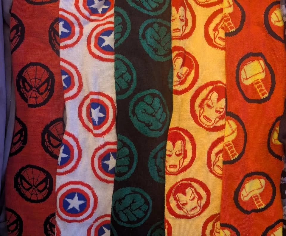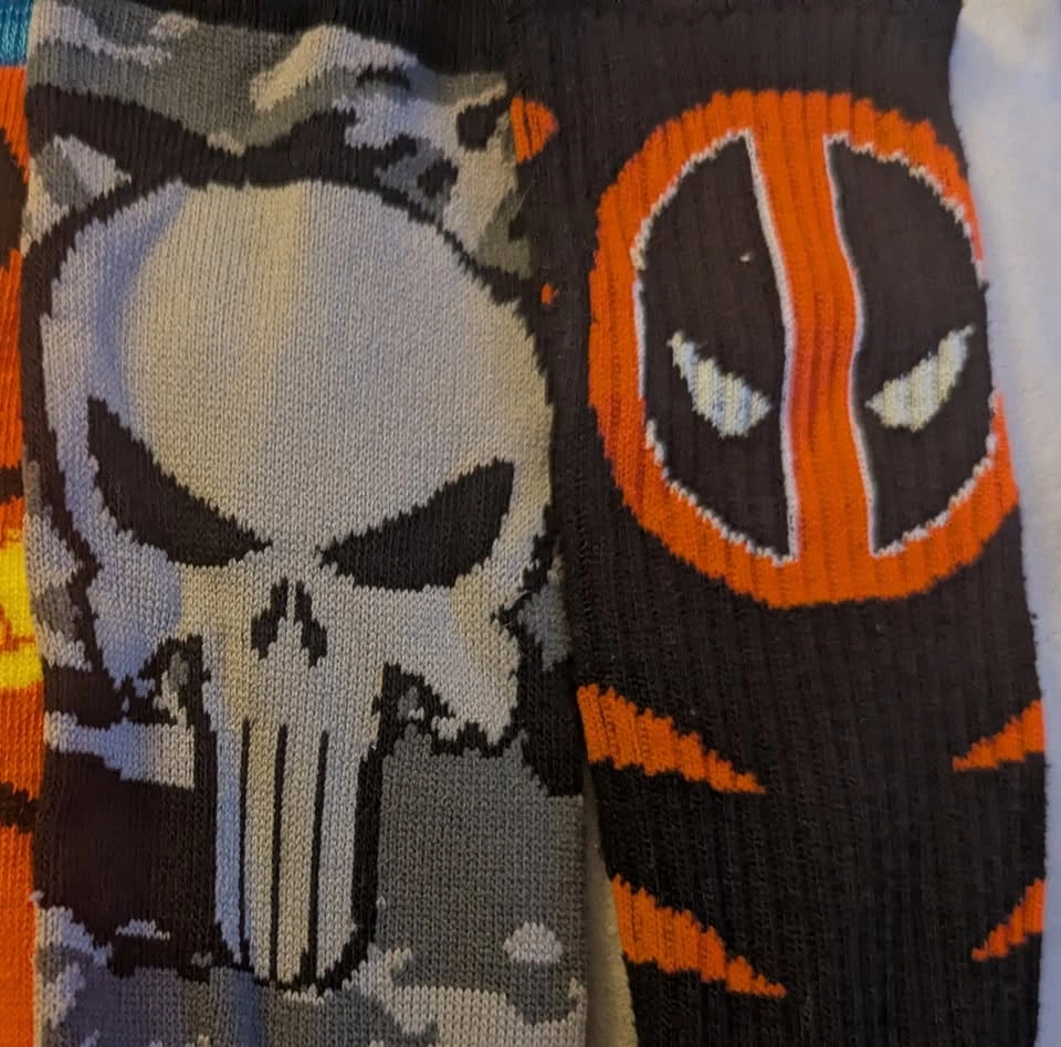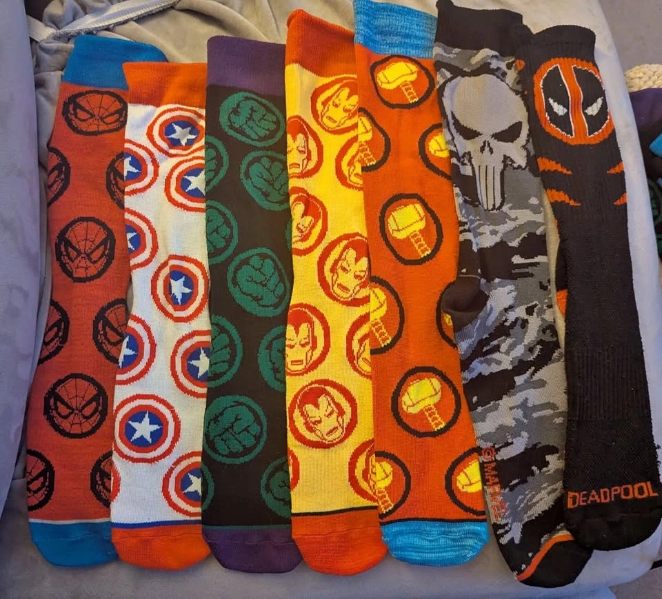 This is a collection of assorted Marvel Avengers Superhero socks featuring the logos for Spider-Man, Captain America, the Incredible Hulk, Iron Man, Thor, the Punisher, and Deadpool. Happy to separate or combine with any of the other listings of socks and clothes that I've posted.