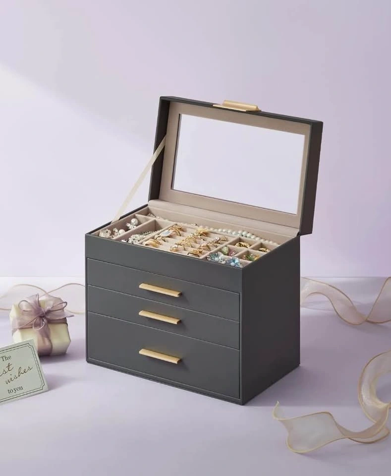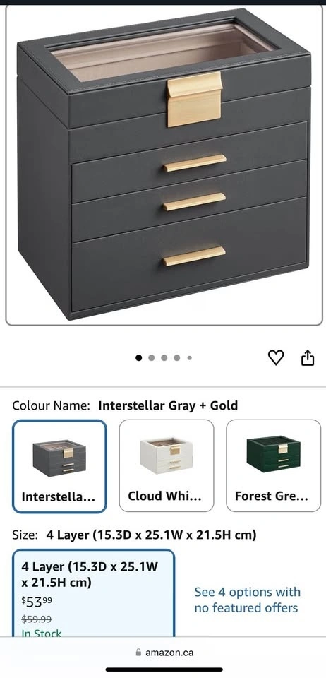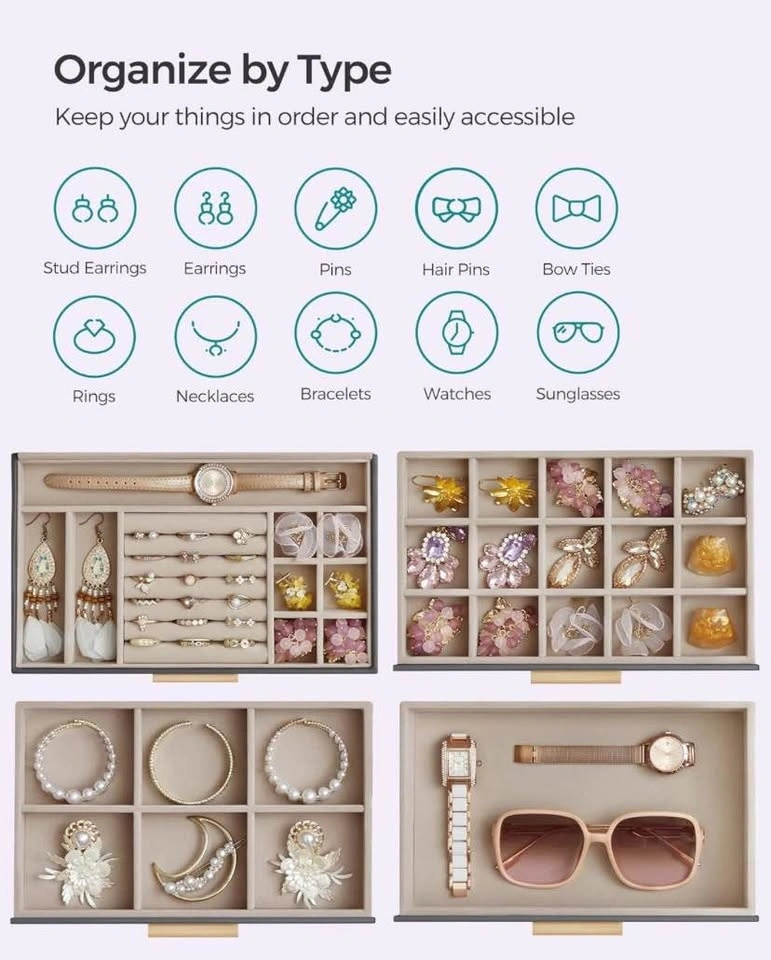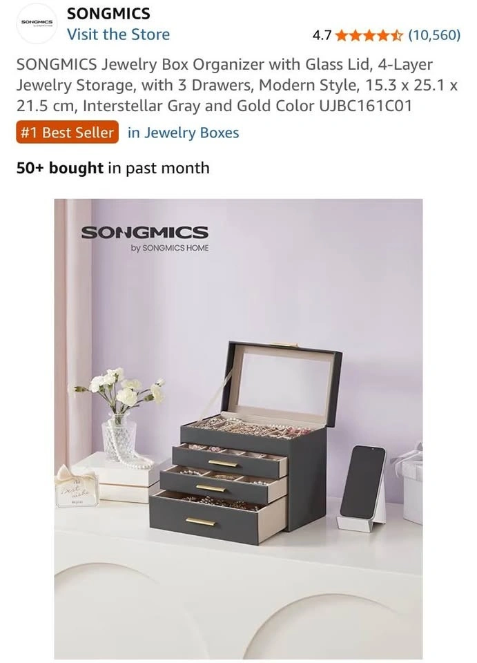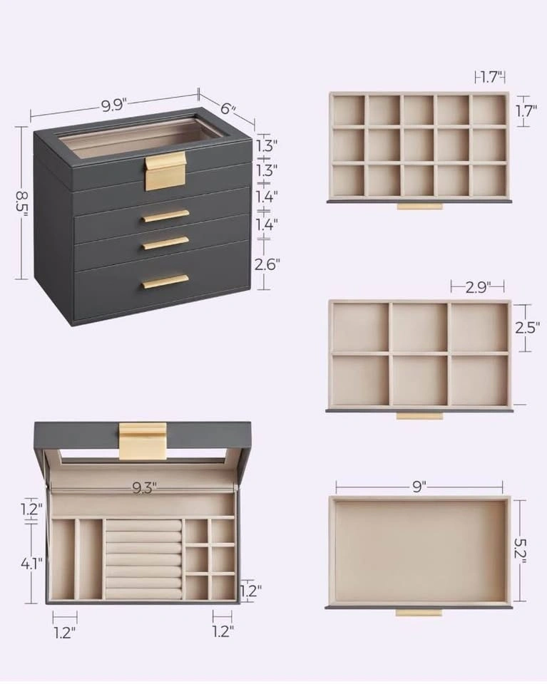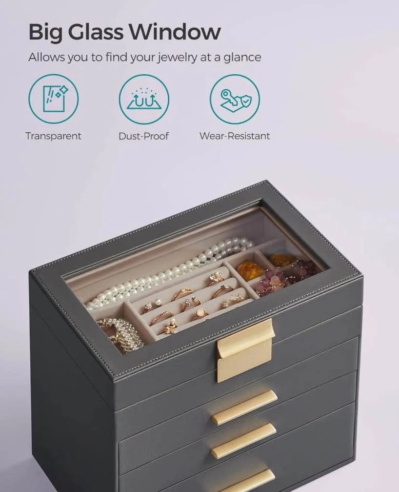 Keep your favorite pieces beautifully organized with the SONGMICS Jewelry Box Organizer. Designed with a sleek glass lid and modern interstellar gray & gold finish, this 4-layer jewelry box adds style and function to any dresser.