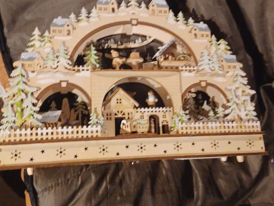Here's a charming wooden Christmas village scene! It features intricate details and a lovely design, perfect for adding a festive touch to your holiday decor