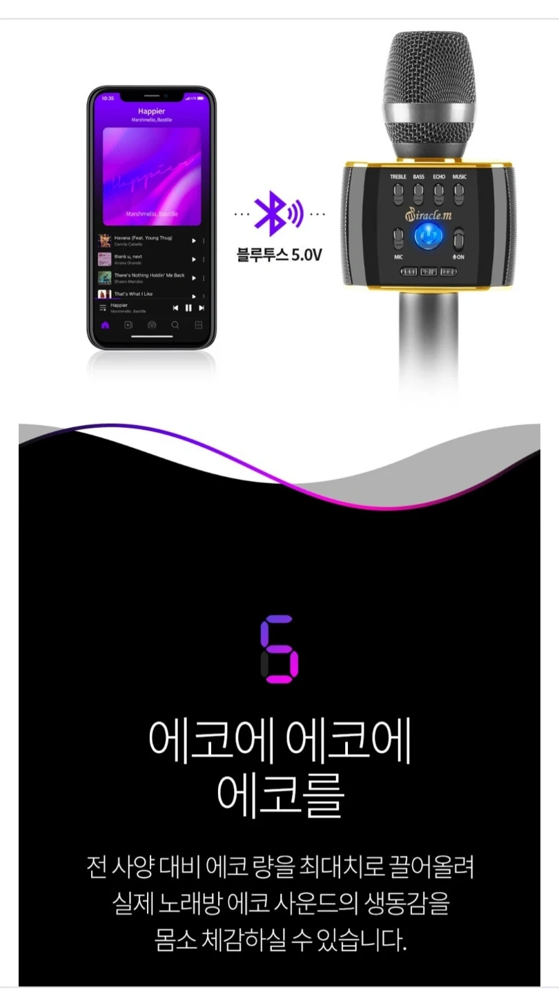 Selling a Miracle M M70 Plus karaoke microphone. It's in great condition and ready for your next karaoke night! It can connect to your phone via Bluetooth 5.0 to play music. It has controls for treble, bass, echo, and music volume right on the microphone itself