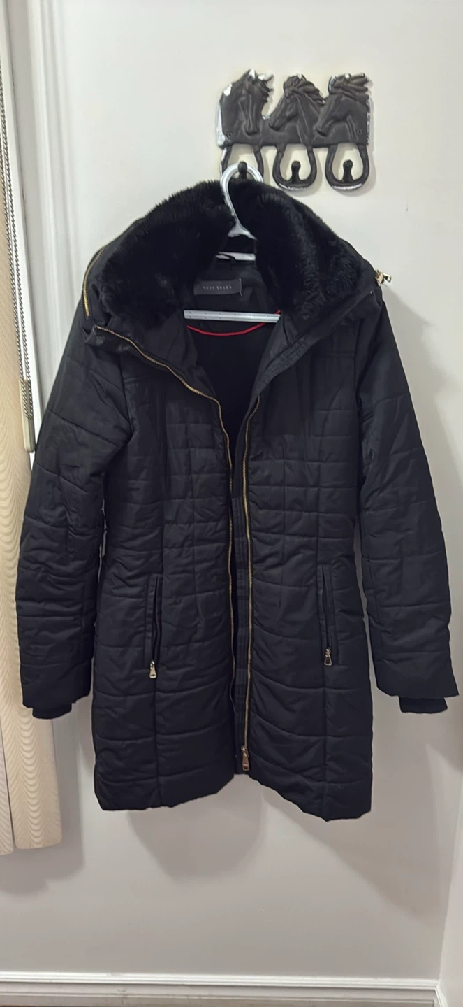 Selling a black winter coat from SAKS FIFTH AVENUE! It has a fur collar and a quilted design. It's in great condition and perfect for the cold weather