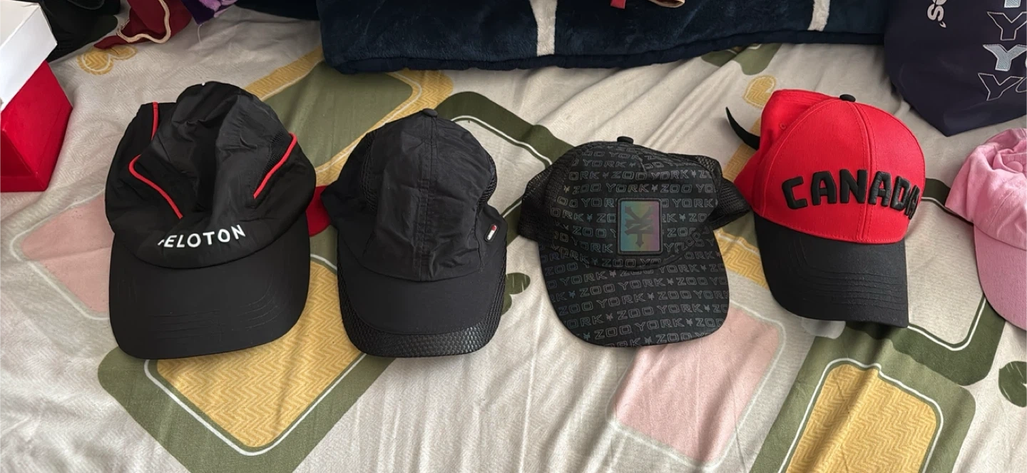 Selling a collection of hats, including a Peloton hat, a Tommy Hilfiger hat, a Zoo York hat, and a Canada hat. Variety of styles and colours!