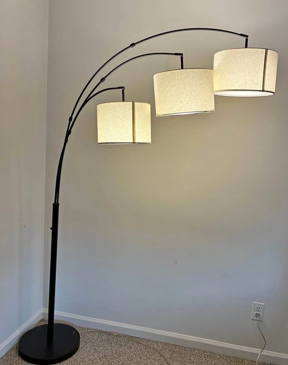 Selling an arc floor lamp featuring three lights! It has a sleek design and would look great in any living room or bedroom. The lamp has a sturdy base and a curved arm that extends over your furniture. The shades are a neutral color that will complement any decor
