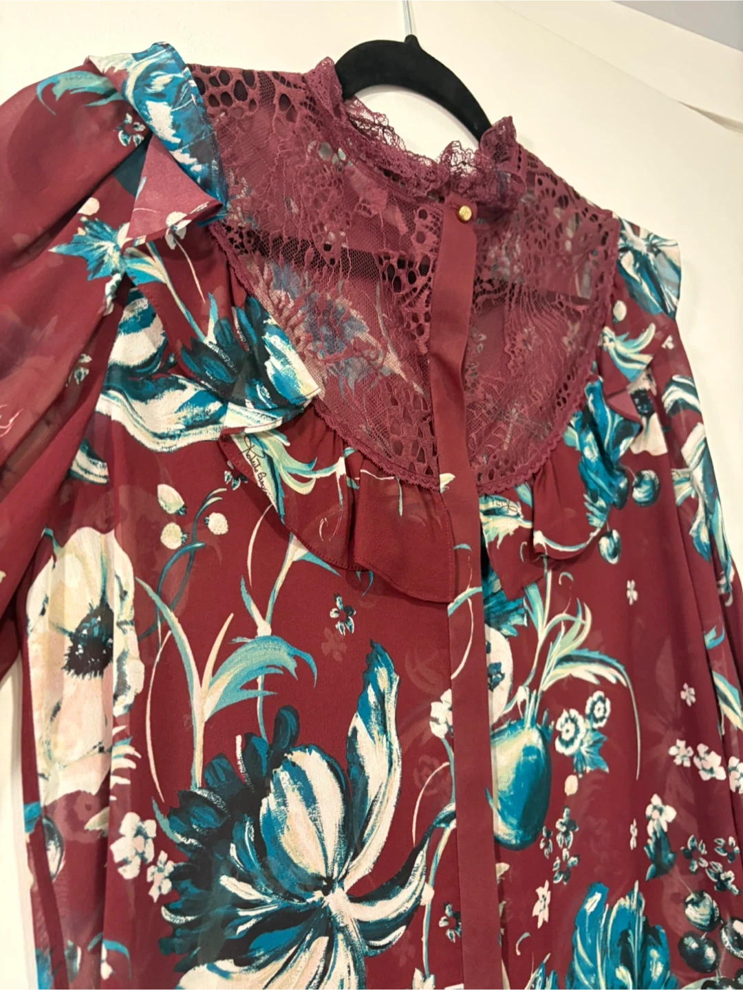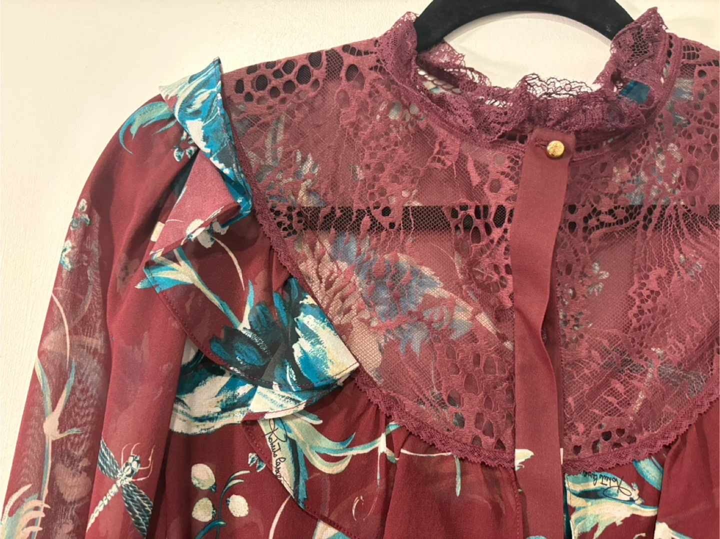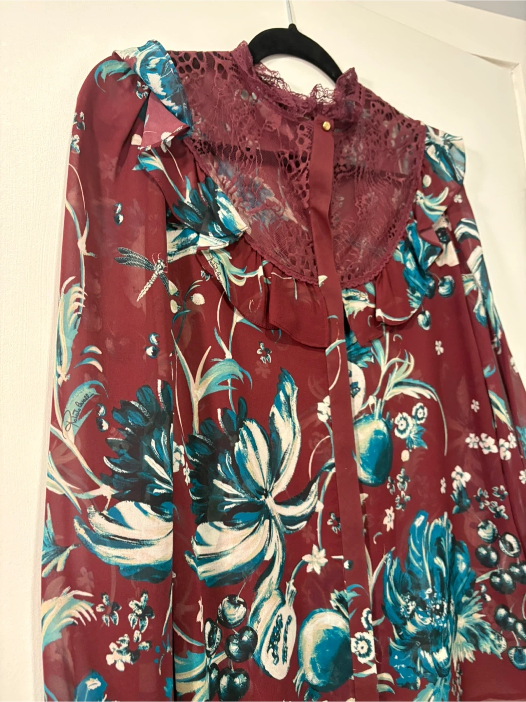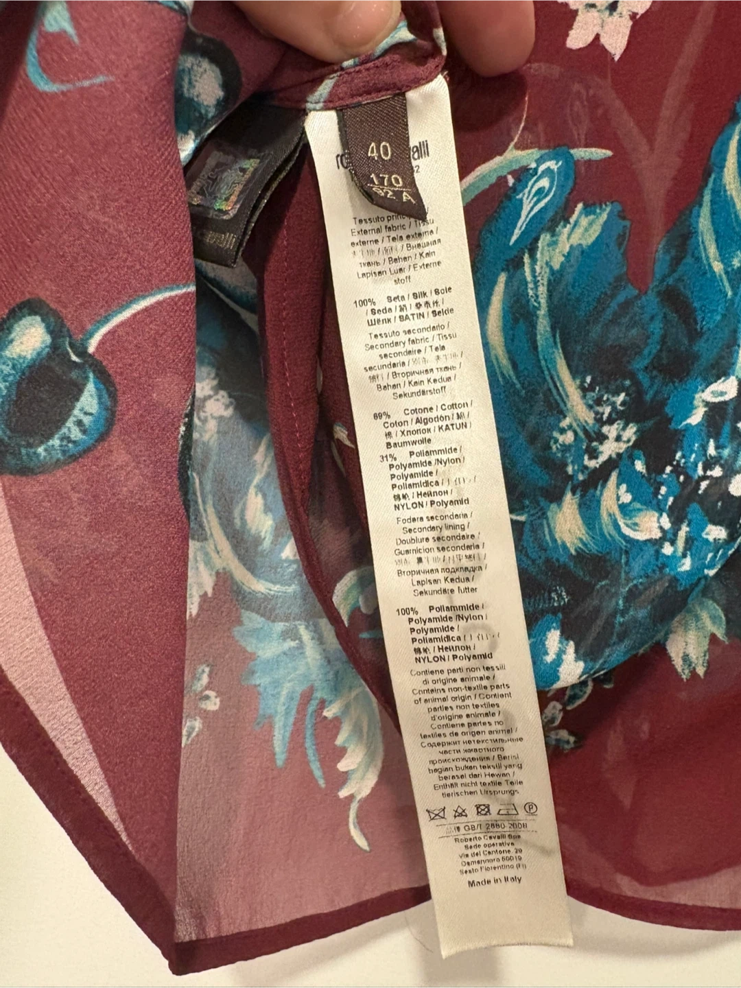 Burgundy red and teal silk and cotton-blend floral embroidered blouse from Roberto Cavalli.