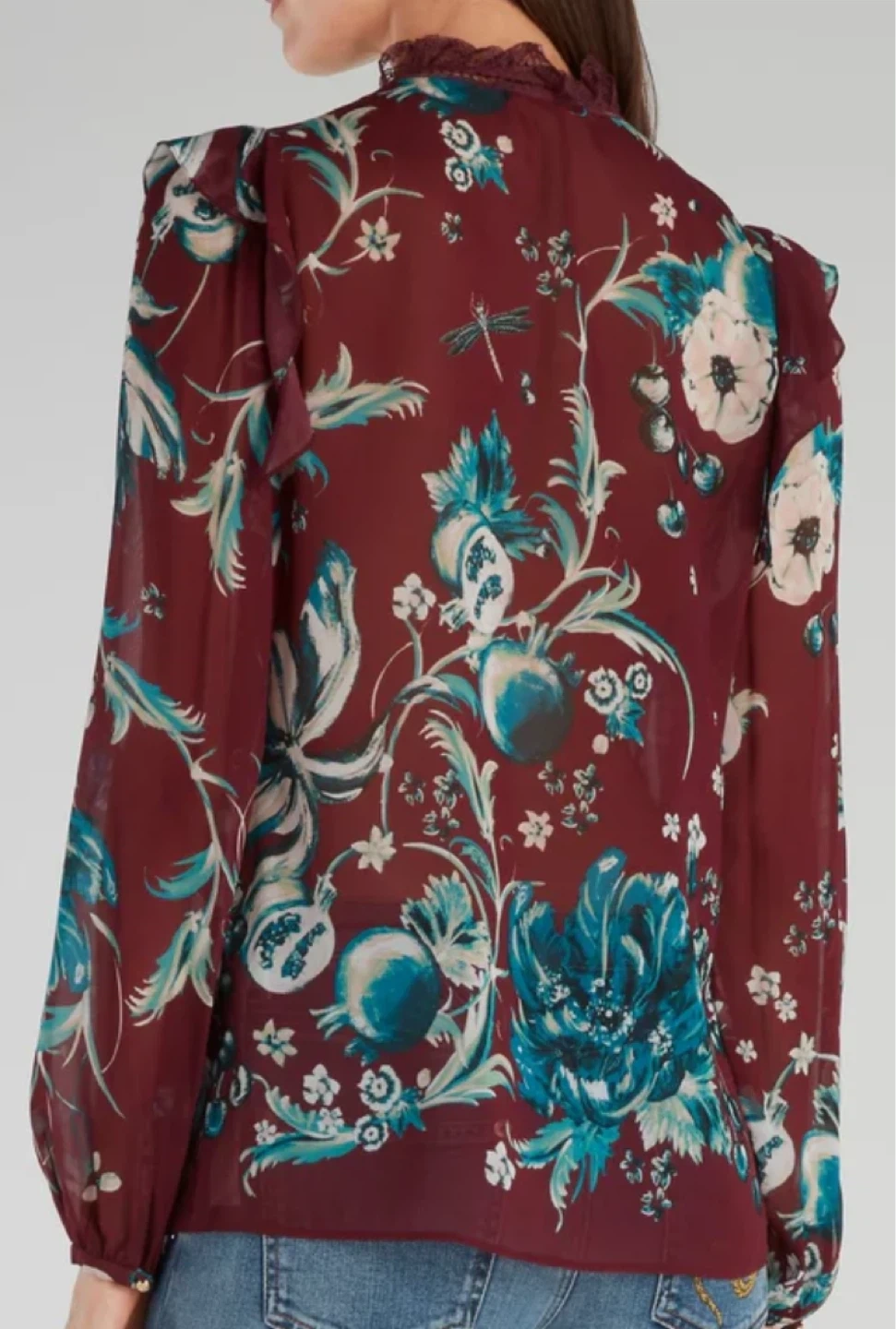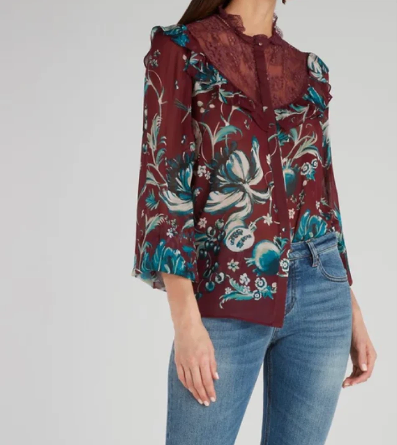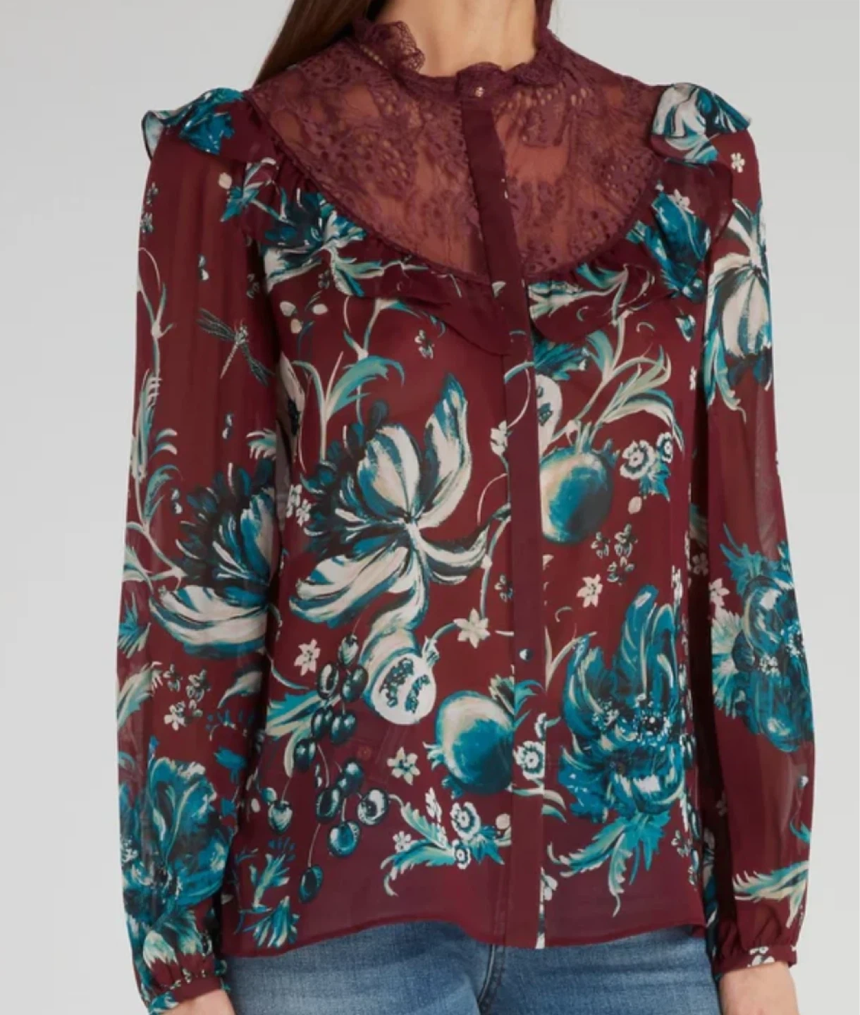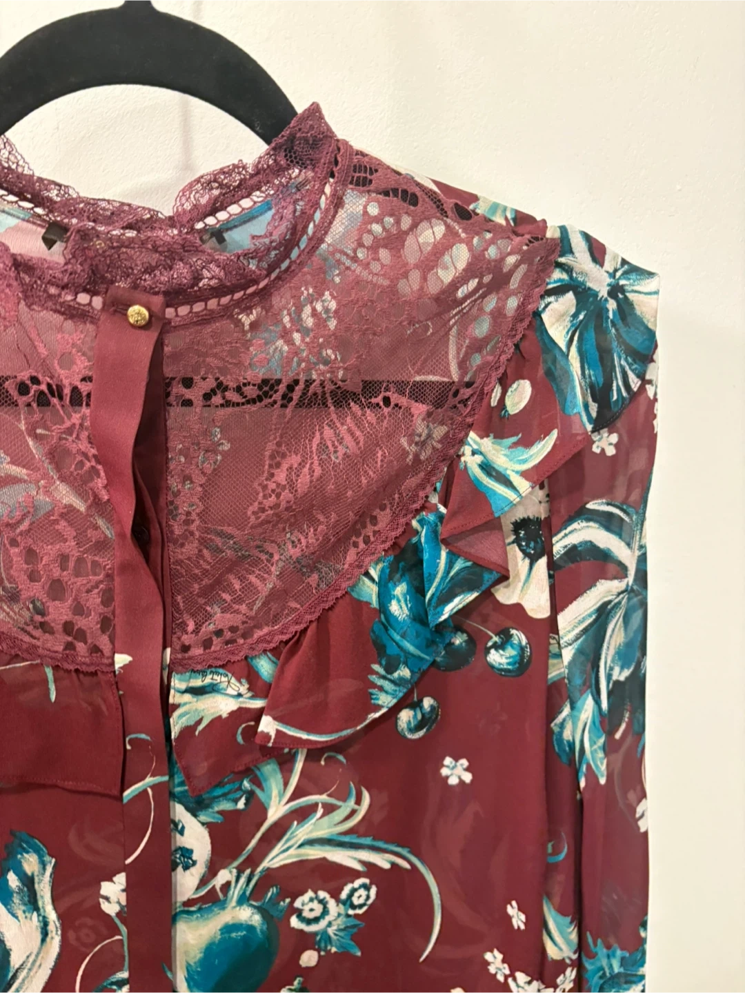 Burgundy red and teal silk and cotton-blend floral embroidered blouse from Roberto Cavalli.