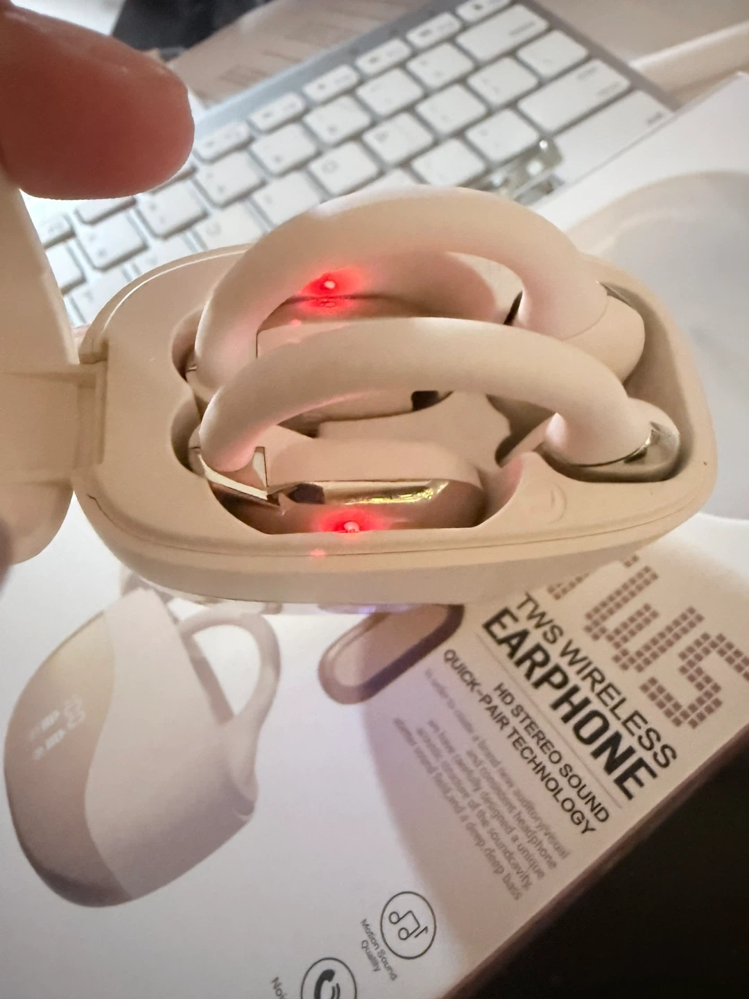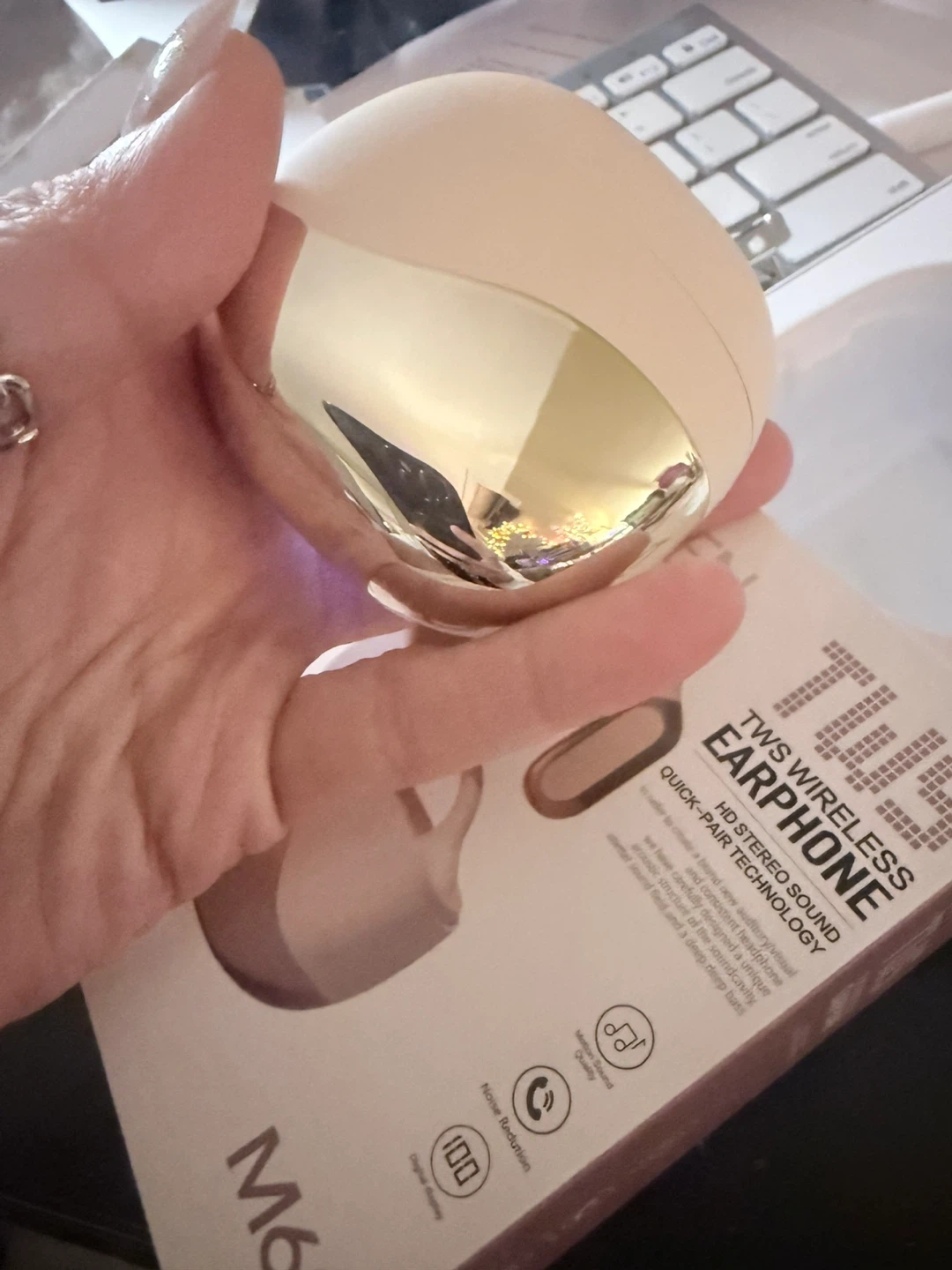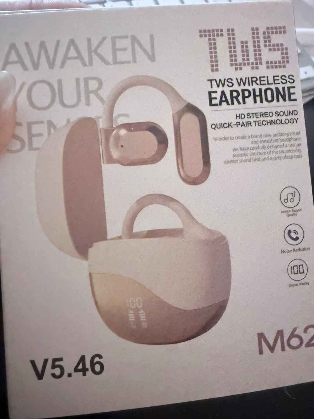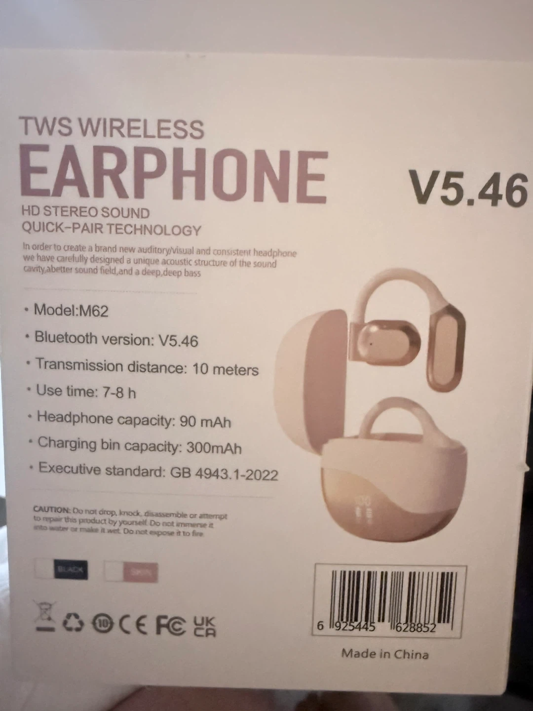 Selling a TWS Wireless Earphone, model M62. It features HD stereo sound and quick-pair technology. The Bluetooth version is V5.46, with a transmission distance of 10 meters. Use time is about 7-8 hours, and the headphone capacity is 90 mAh. The charging bin capacity is 300mAh. Comes with the original box