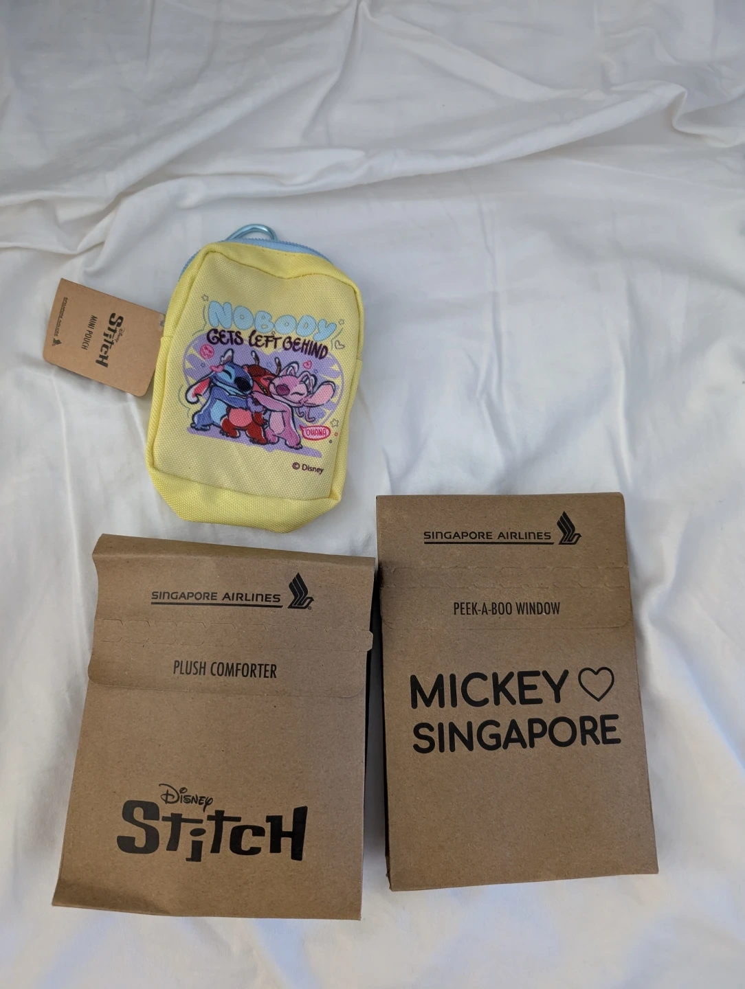 Selling a cute Disney Stitch mini pouch and a Singapore Airlines plush comforter! The pouch features Stitch with the saying "Nobody gets left behind". The plush comforter comes in its original packaging.