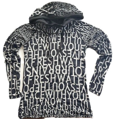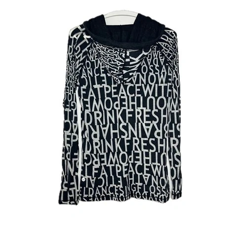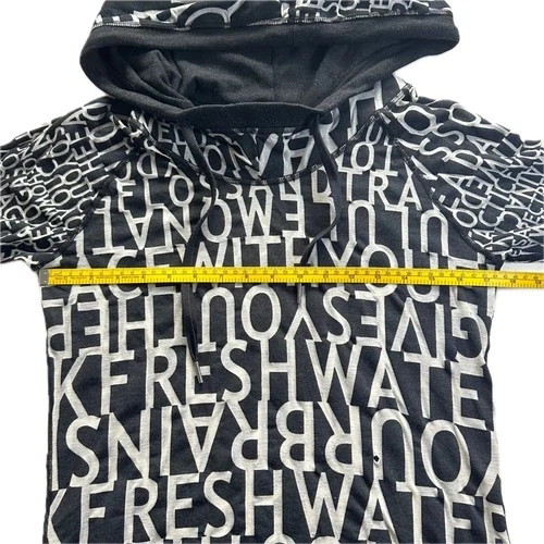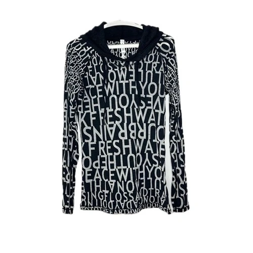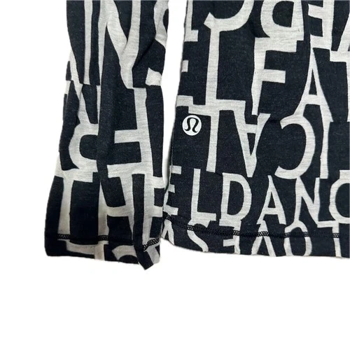 Lululemon Hoodie, a perfect blend of style and comfort. Size 12, this pullover features a classic mock neck and long raglan sleeves. Lightweight yet cozy blend of cotton. Black and gray with a lettering pattern. Machine-washable. Condition : Fair condition. Small holes on front and arm. See photos Size : 12 Colour : Black Grey Style : Hoodie Fit : Slim Approximate Measurements Flat Lay : Armpit to armpit : 17.25 inch Length from top of shoulder : 27 inch Sleeve : 27.5 inch Contents : 50% Pima Cotton 44% Polyester 6% Spandex Flat lay measurements are approximate. Color may vary depending on the lighting differences. Please check photos before purchase.