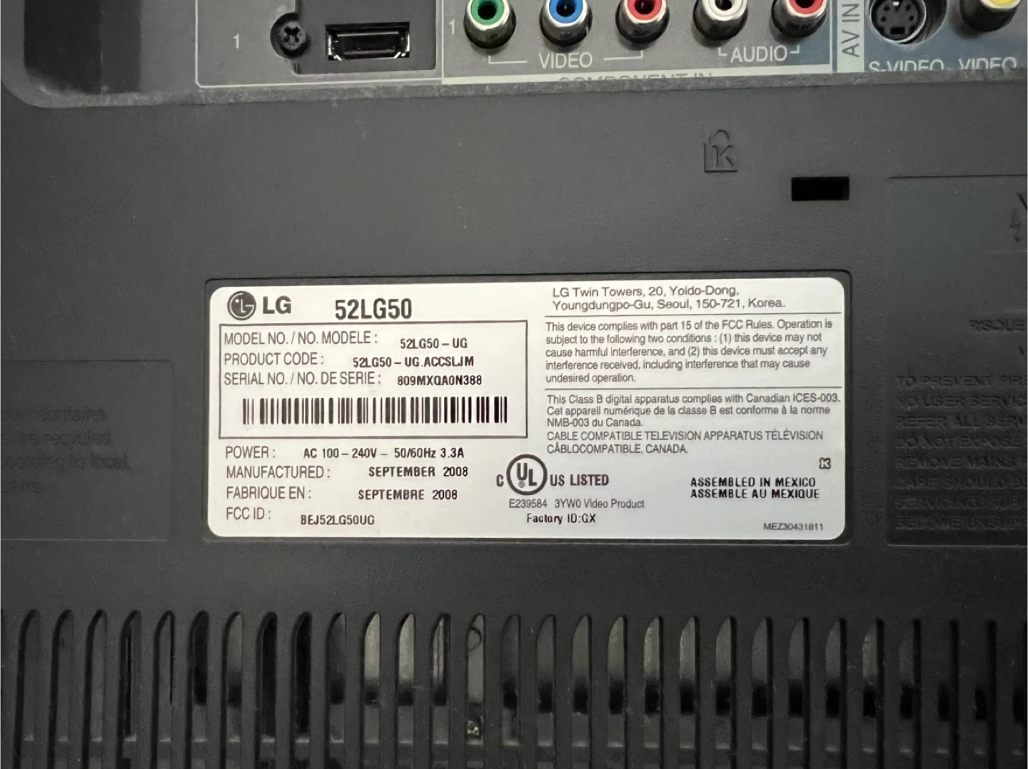 Selling an LG 52LG50 52-inch LCD TV. The model number is 52LG50-UG. It was manufactured in September 2008. Feel free to ask any questions!