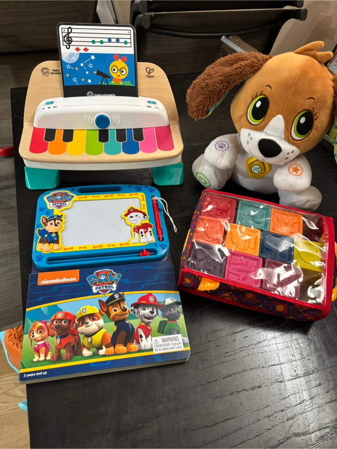 Selling a bundle of gently used baby and toddler toys! Included are: - Baby Einstein piano by Hape - Paw Patrol book and magnetic drawing board - Soft blocks in a carrying case - Leap Frog Talking dog - songs and learning