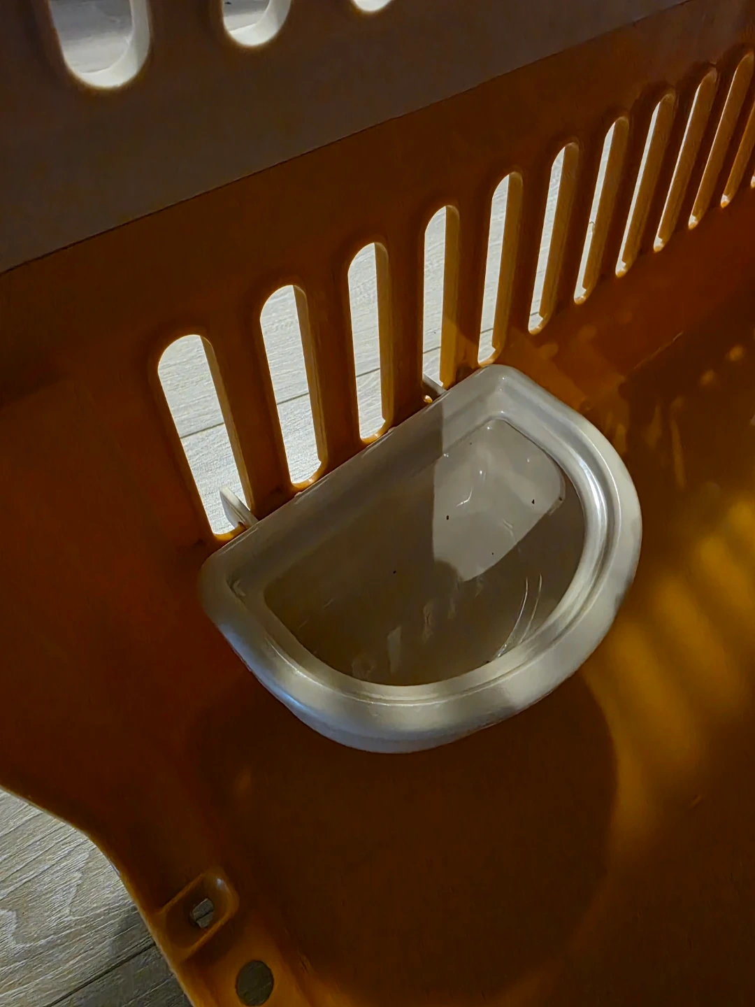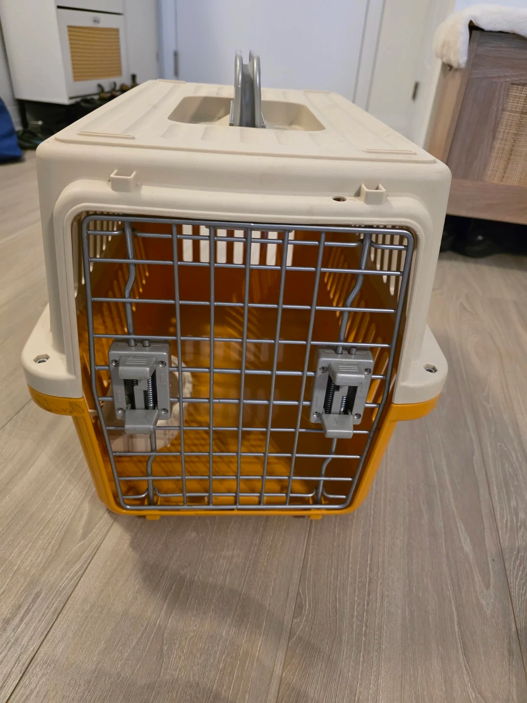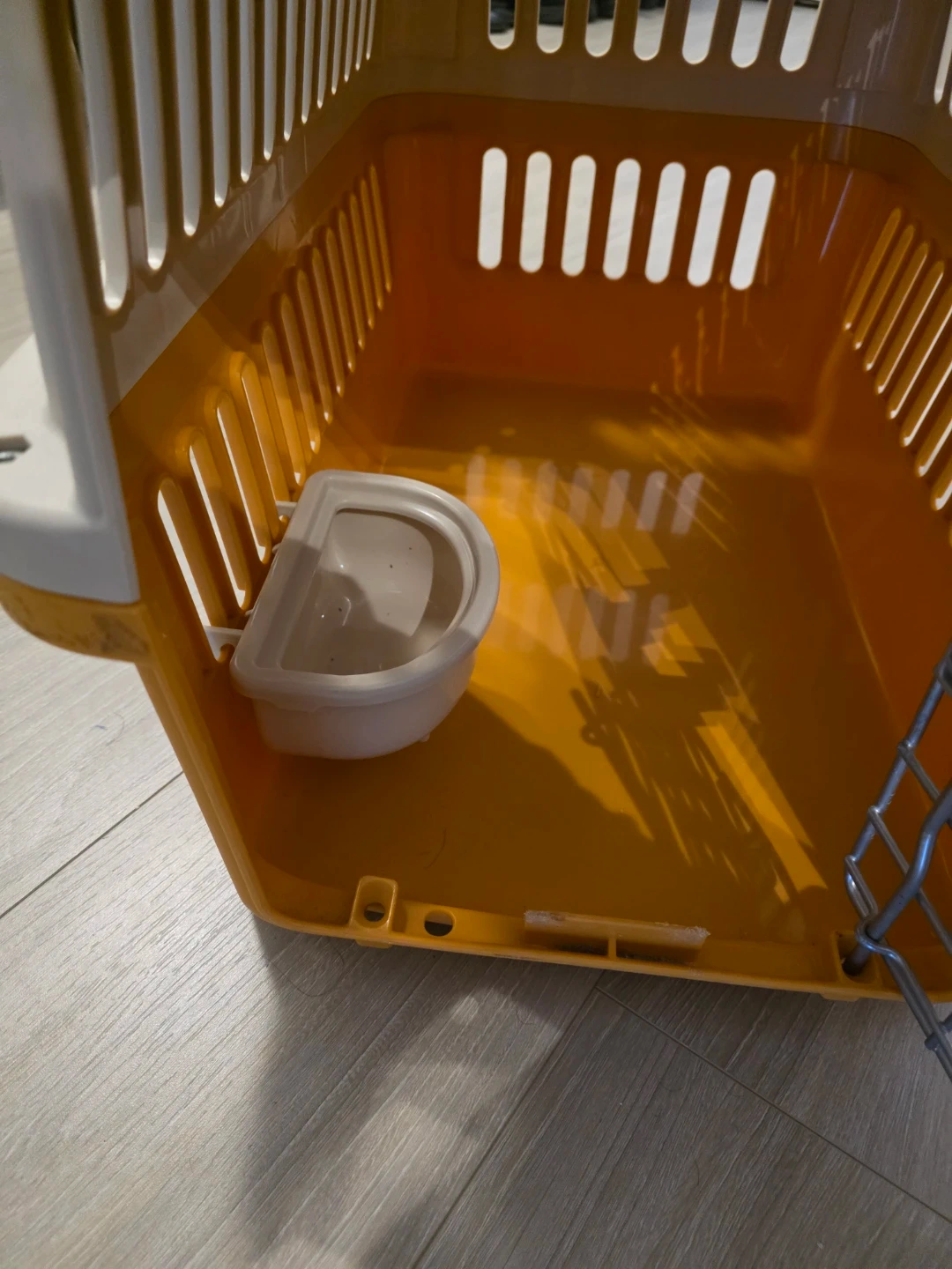 This is ideal for small pets. It has a bowl as well. The door can be detached. Easy to carry with the sturdy handle. Perfect for traveling. Excellent condition. We bought it for our 5 lbs poodle, buy hardly used it.