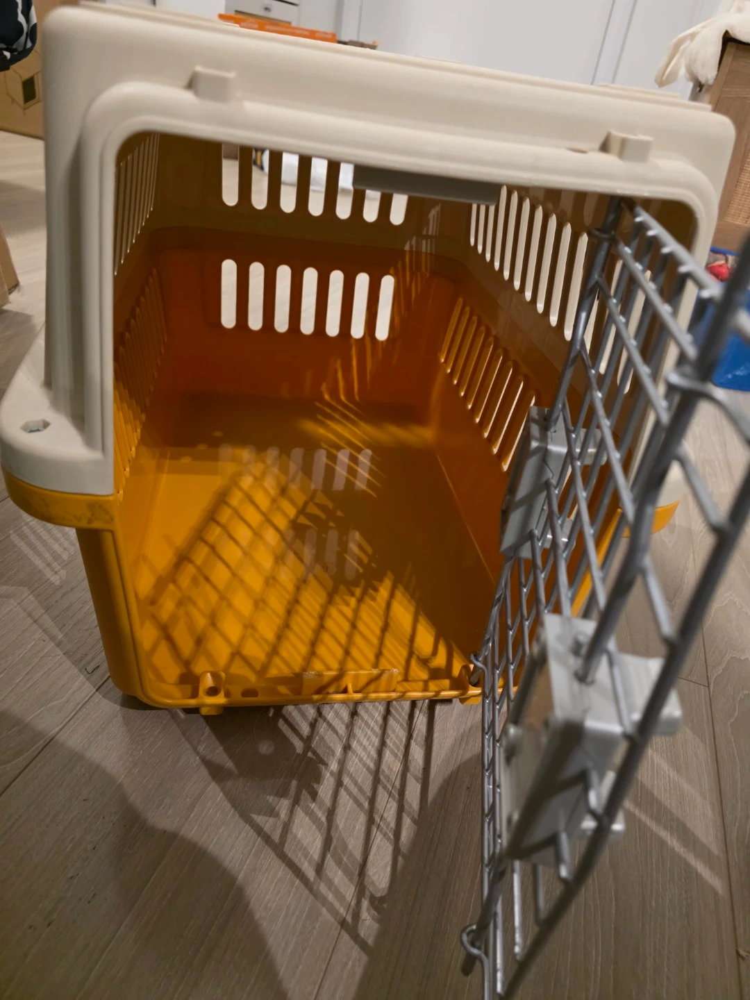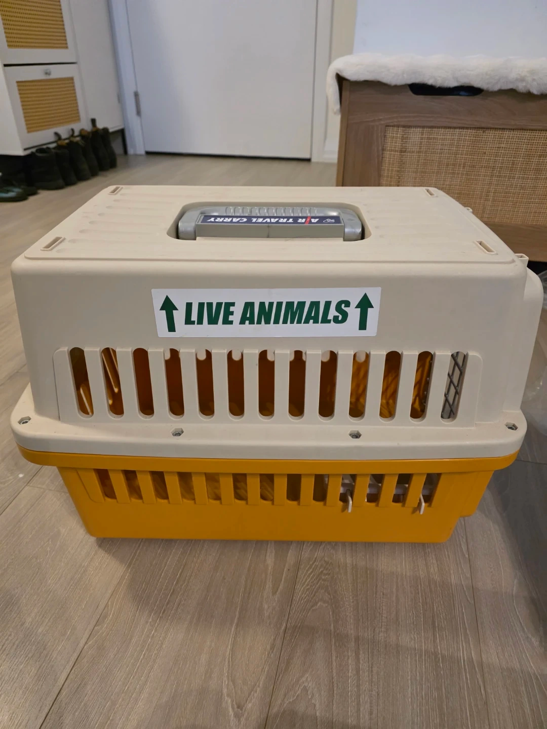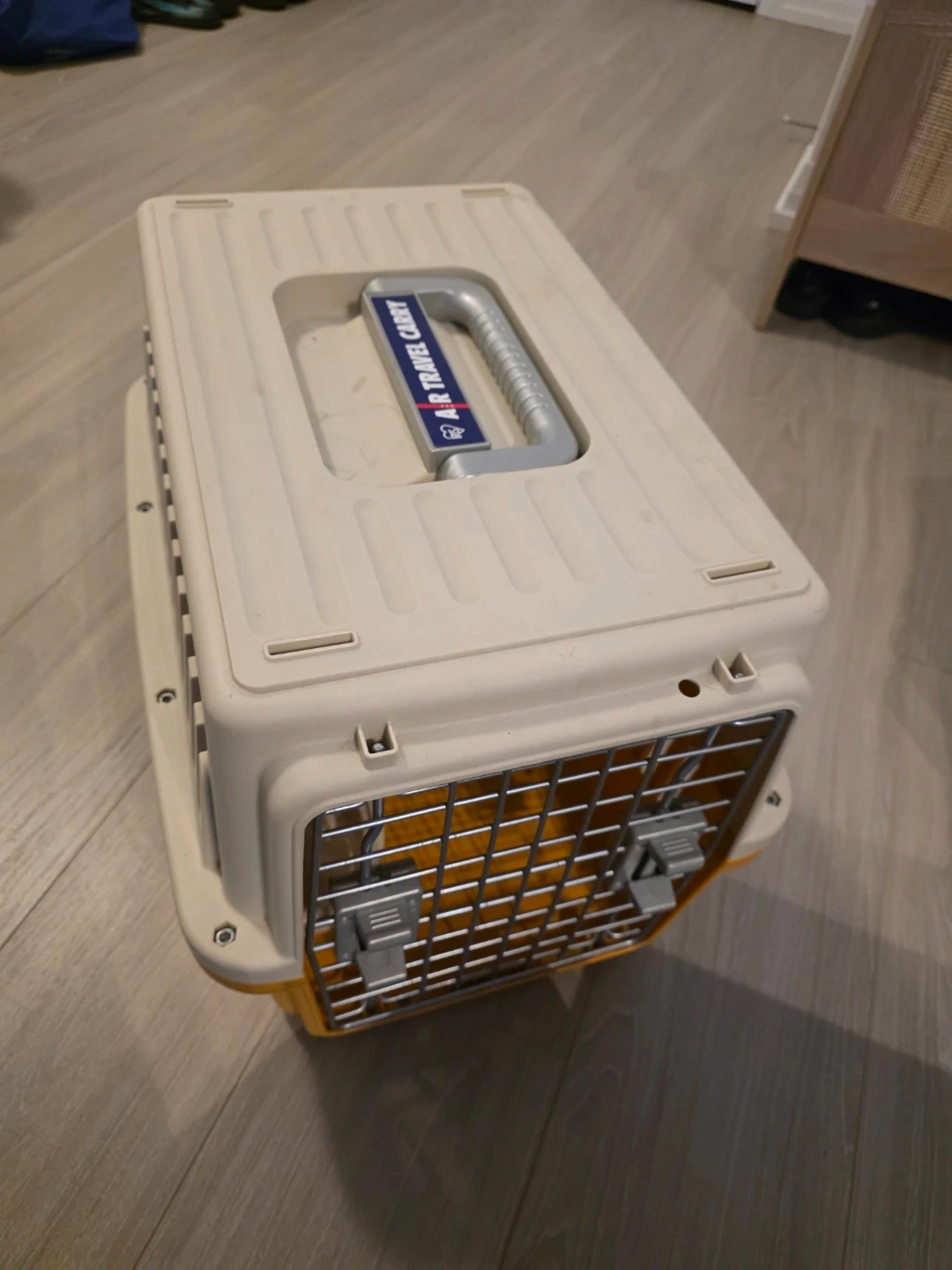 This is ideal for small pets. It has a bowl as well. The door can be detached. Easy to carry with the sturdy handle. Perfect for traveling. Excellent condition. We bought it for our 5 lbs poodle, buy hardly used it.