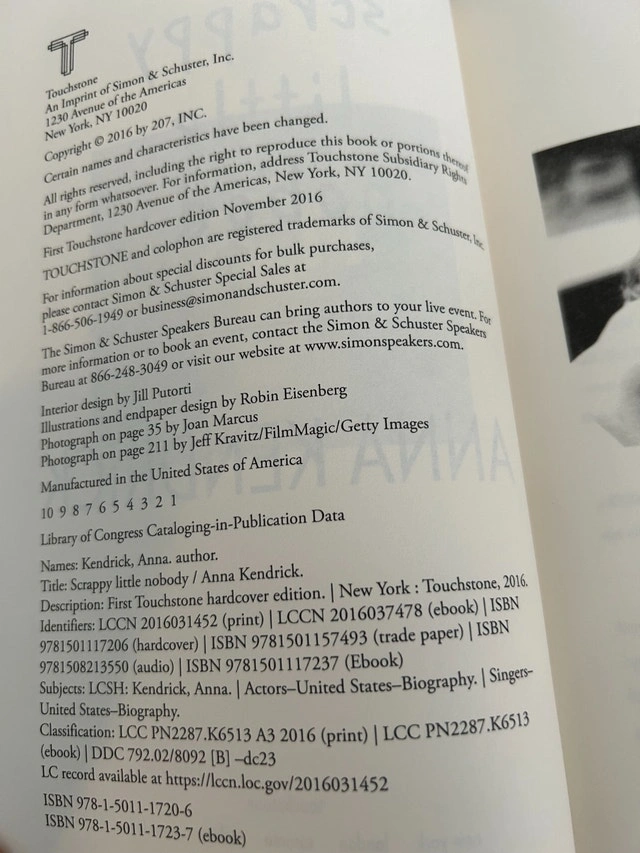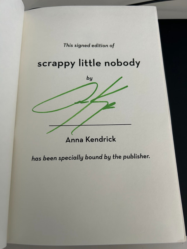 ANNA KENDRICK SIGNED - SCRAPPY LITTLE NOBODY This book is in excellent condition and was signed by Anna Kendrick on a special "tip in" page bound in the book. The book was sold as a signed edition directly by the publisher. Signed uniquely in green marker! (see picture) First Edition; 1st Printing with full number line