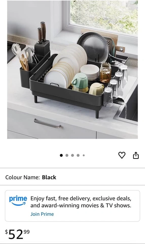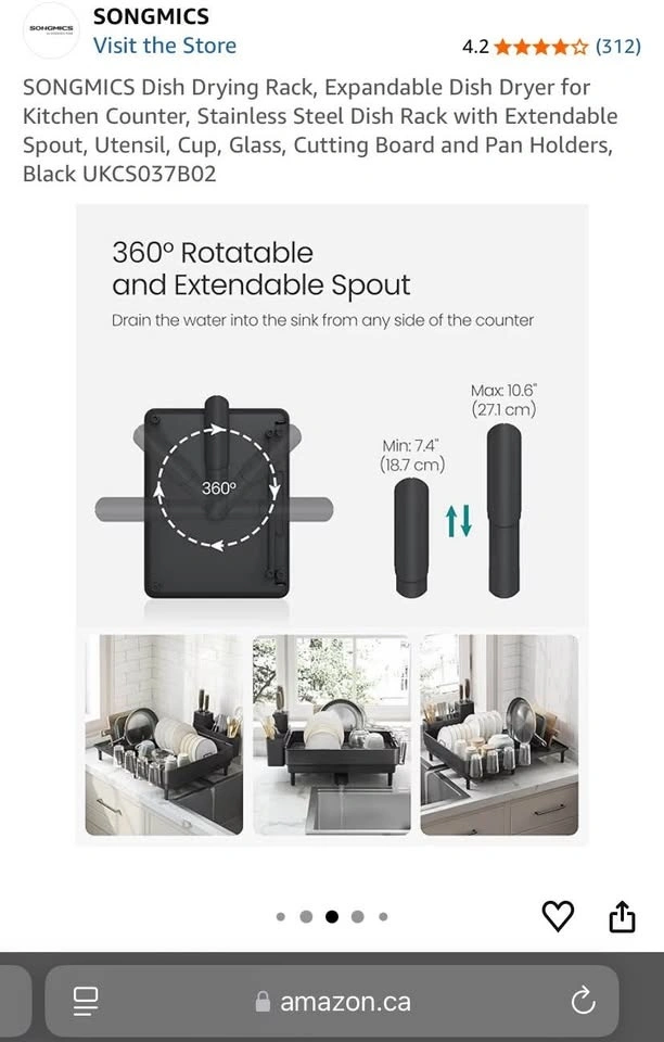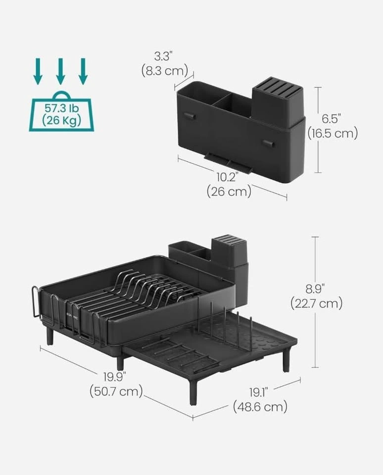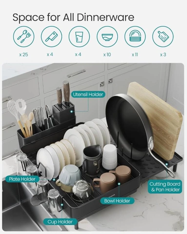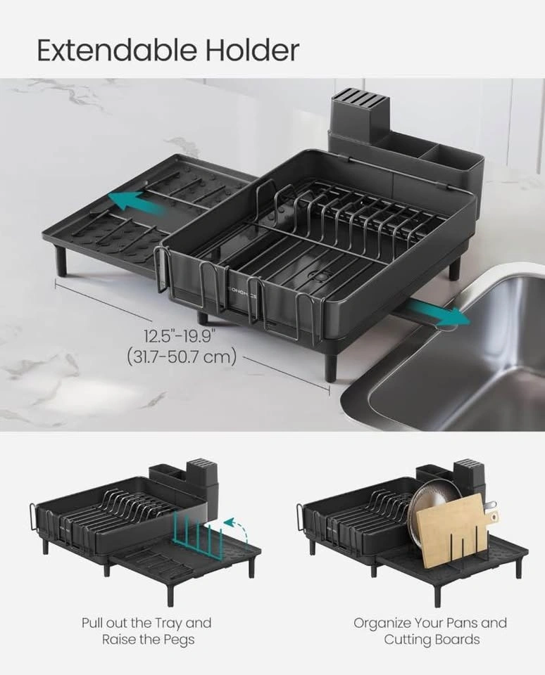 Keep your kitchen counter neat and efficient with the SONGMICS Expandable Dish Drying Rack. Made from durable stainless steel with a sleek black finish, this rack adapts to your needs while keeping dishes organized and dry.