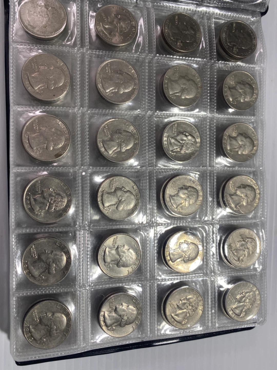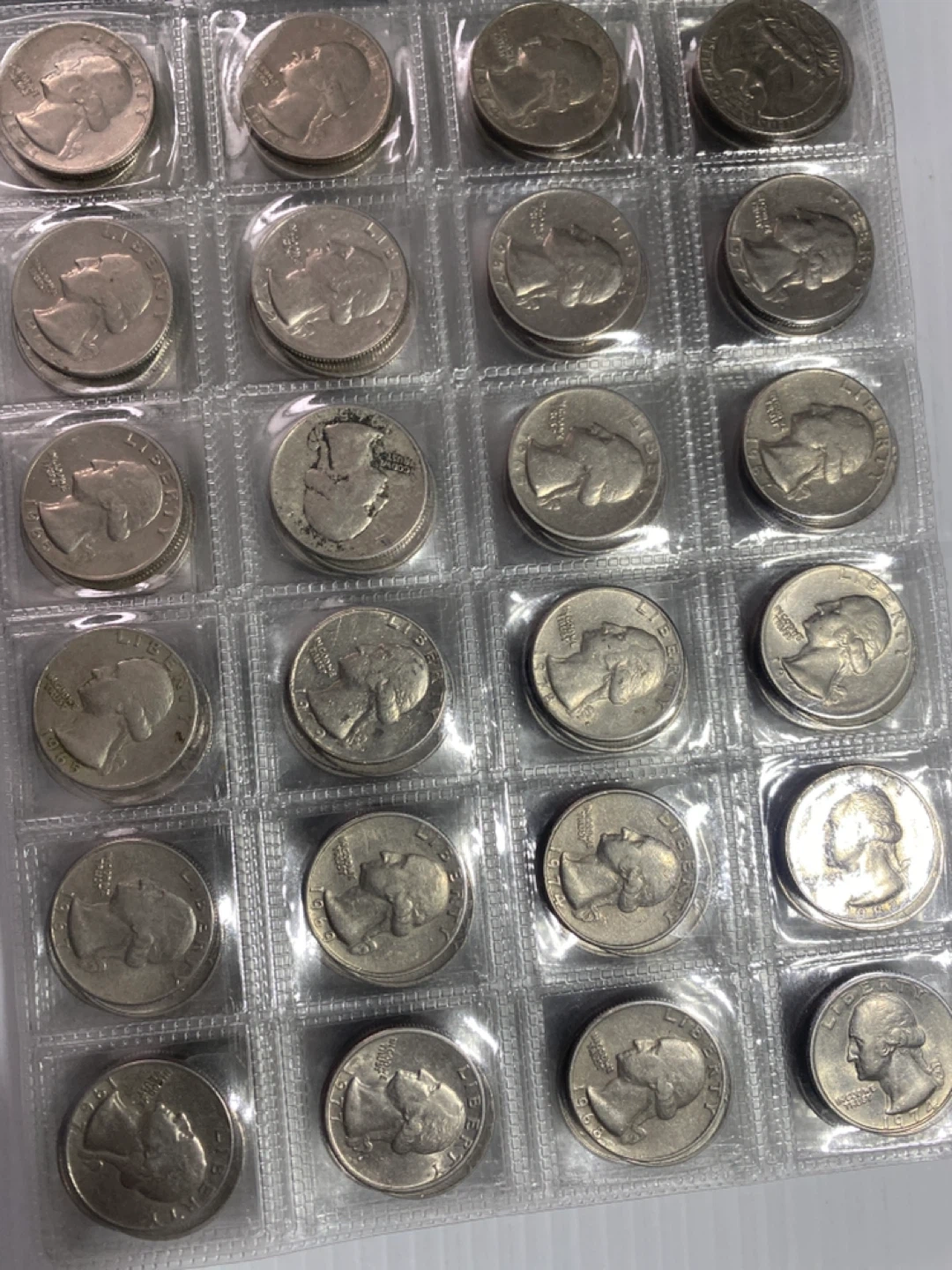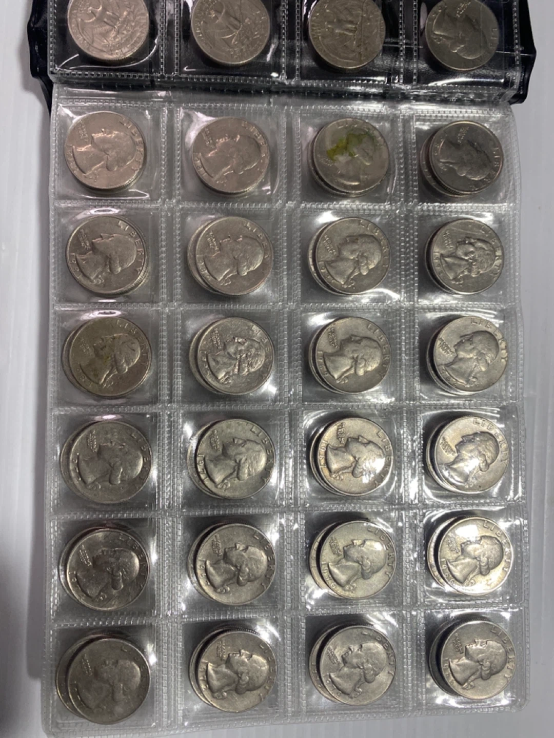 Selling a coin collection featuring US quarters and nickels. The coins are housed in a protective display case, perfect for collectors or anyone interested in numismatics. They show some signs of wear consistent with their age, but are in overall good condition