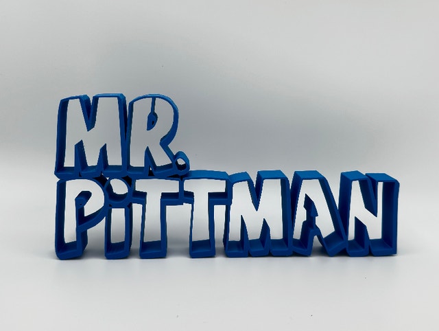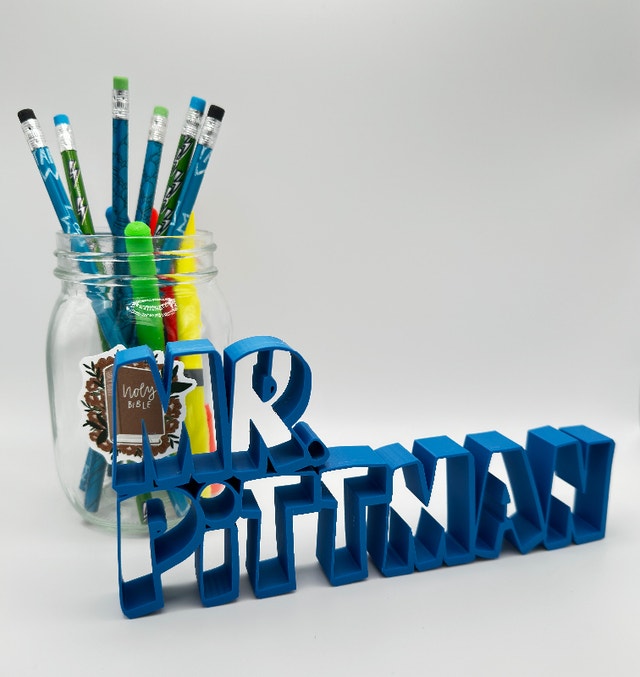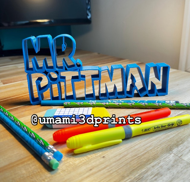 We make custom 3D printed name plates, great for teachers! :) Material: PLA, a biodegradable material. Height: 3”-5”, Length: 6”-8”. Size varies due to the length of the name.