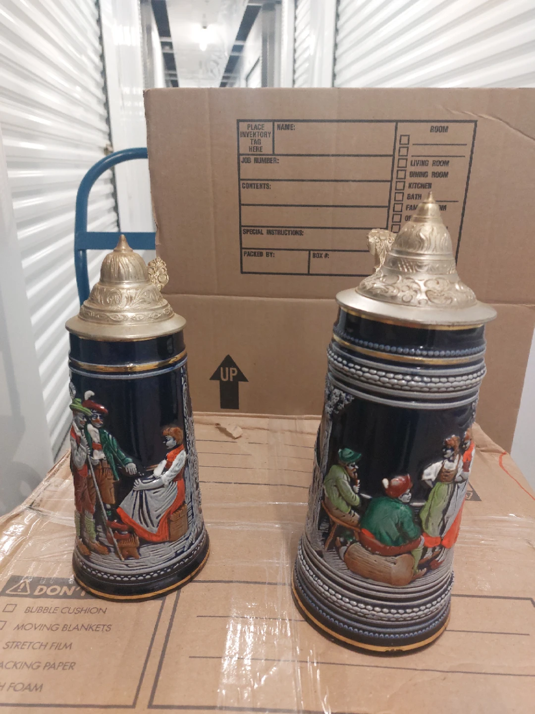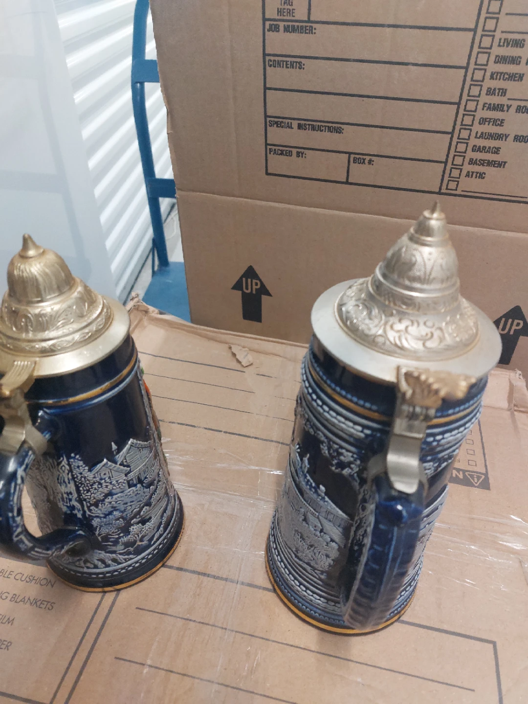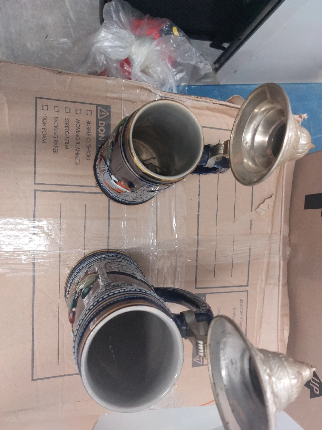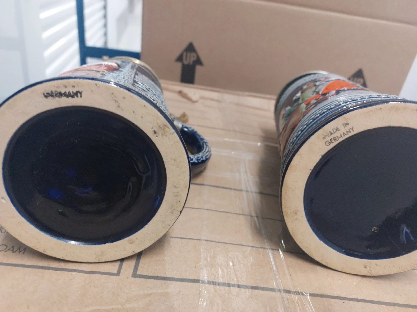 Selling a set of two vintage German beer steins. They feature intricate designs and are marked "Made in Germany" on the base. Perfect for collectors or anyone who appreciates traditional German craftsmanship!