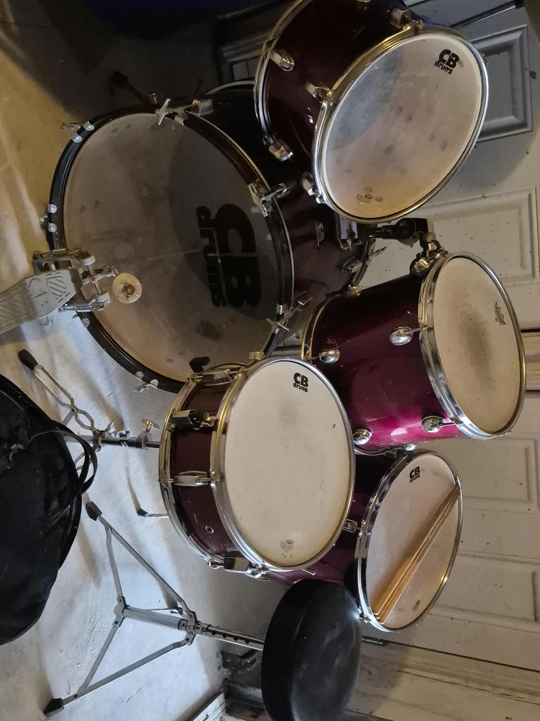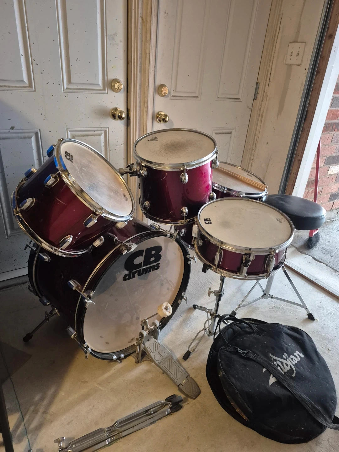 Selling a CB Drums set in a burgundy colour. Perfect for someone just starting out, wants to use it for therapeutic purposes, or looking for a practice set. Extra cymbals in equipment bag...