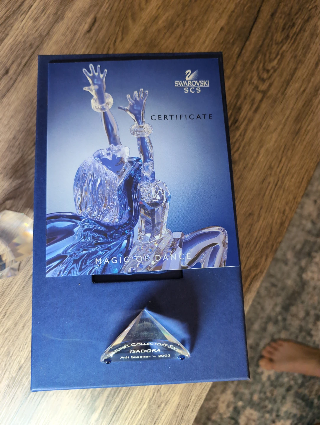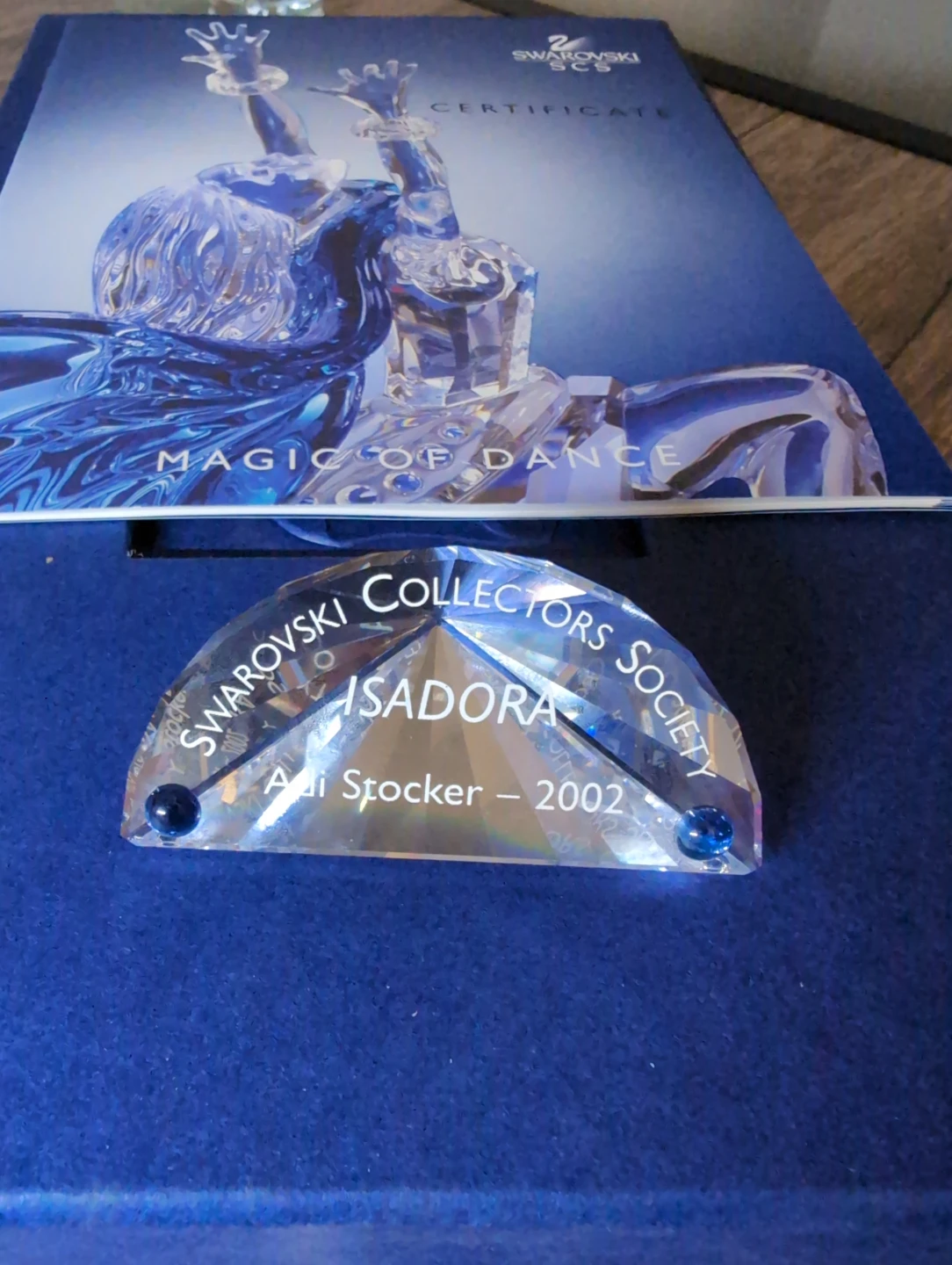 Selling a beautiful Swarovski Crystal figurine of Isadora. It's part of the Swarovski Collectors Society and is in excellent condition. The figurine is clear and blue, and it comes with the original box and certificate. A stunning piece for any collector!