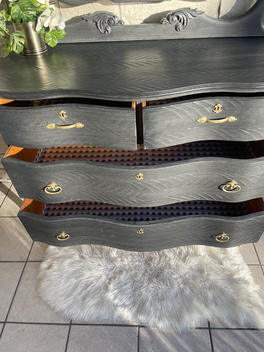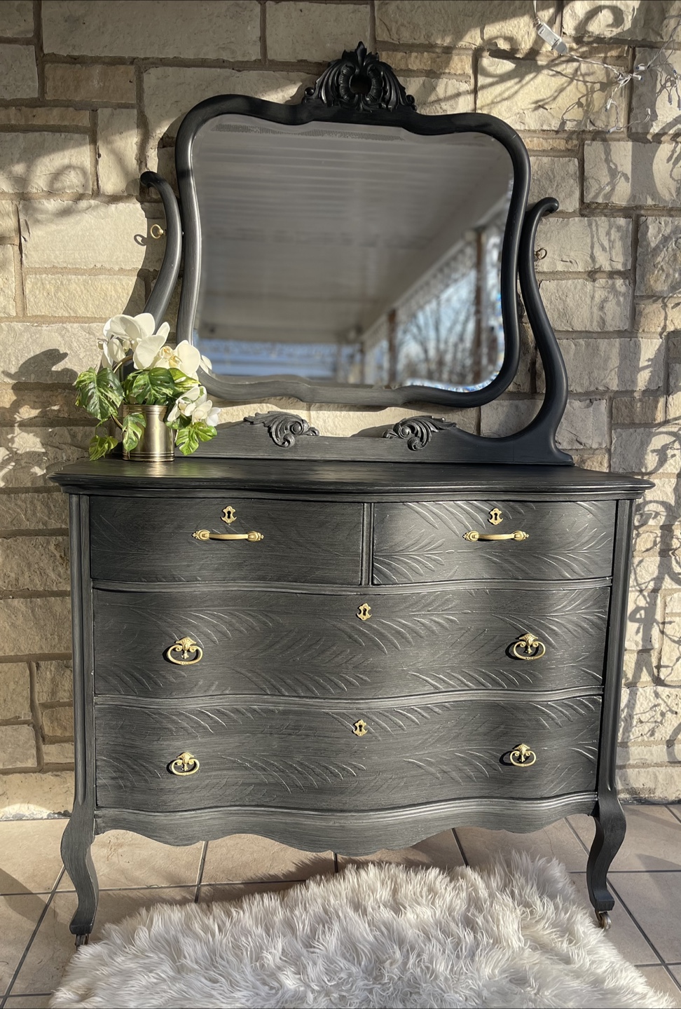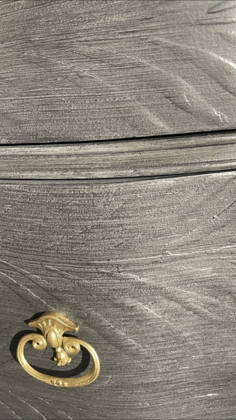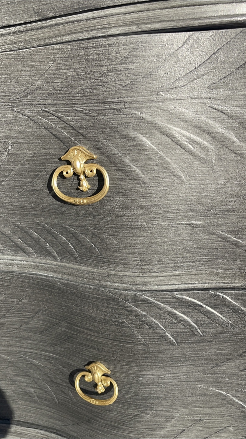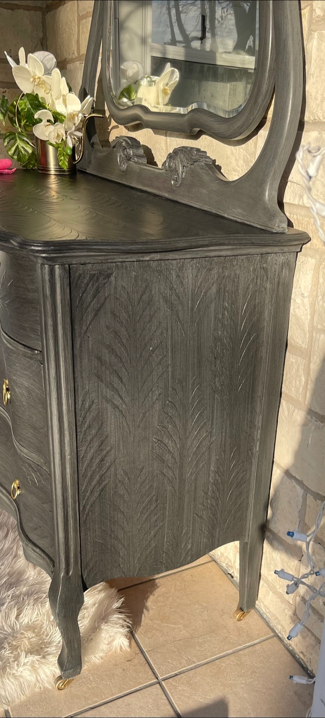 Beautiful 4 drawers Victorian Entrance Piece/ Vanity/Dresser redone in modern brushed gray color with raised stencil details.