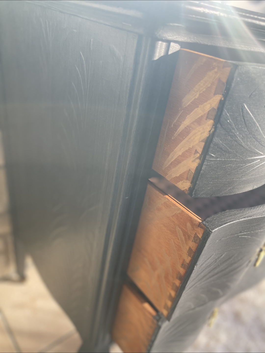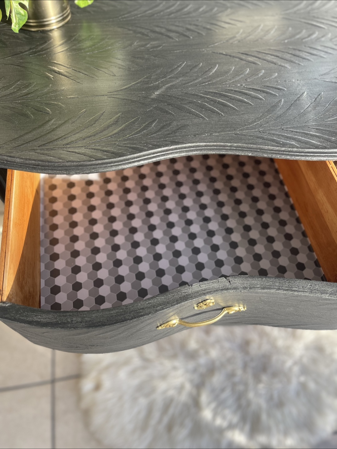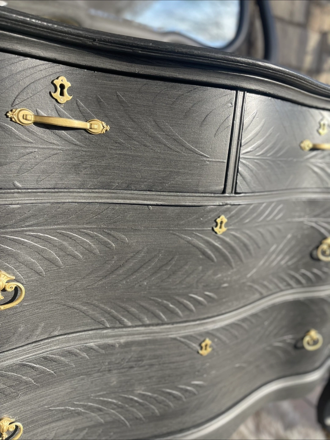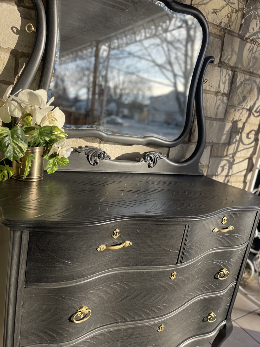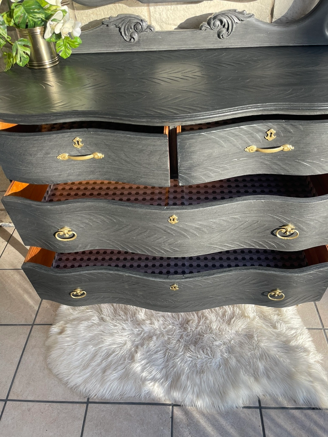 Beautiful 4 drawers Victorian Entrance Piece/ Vanity/Dresser redone in modern brushed gray color with raised stencil details.