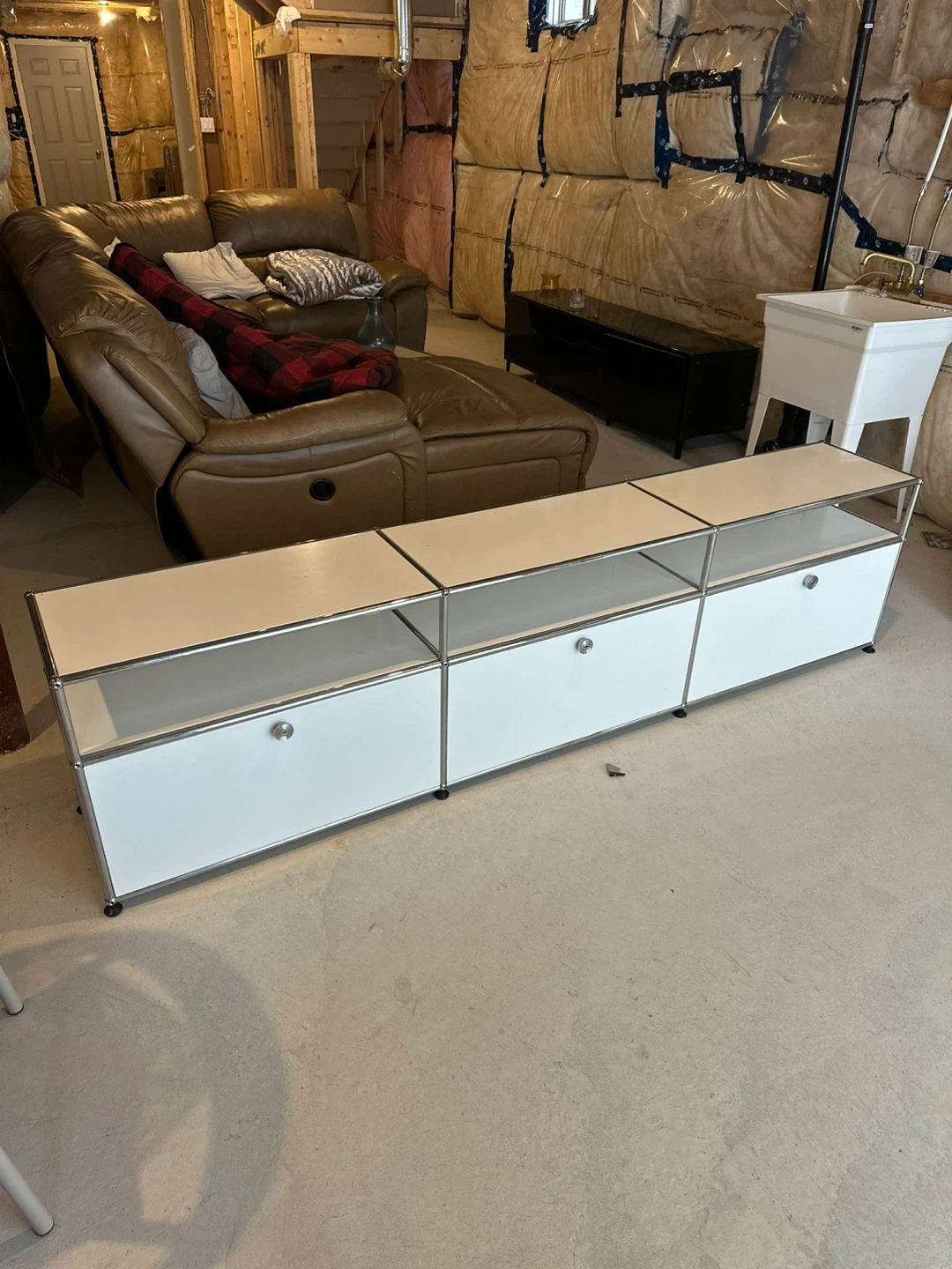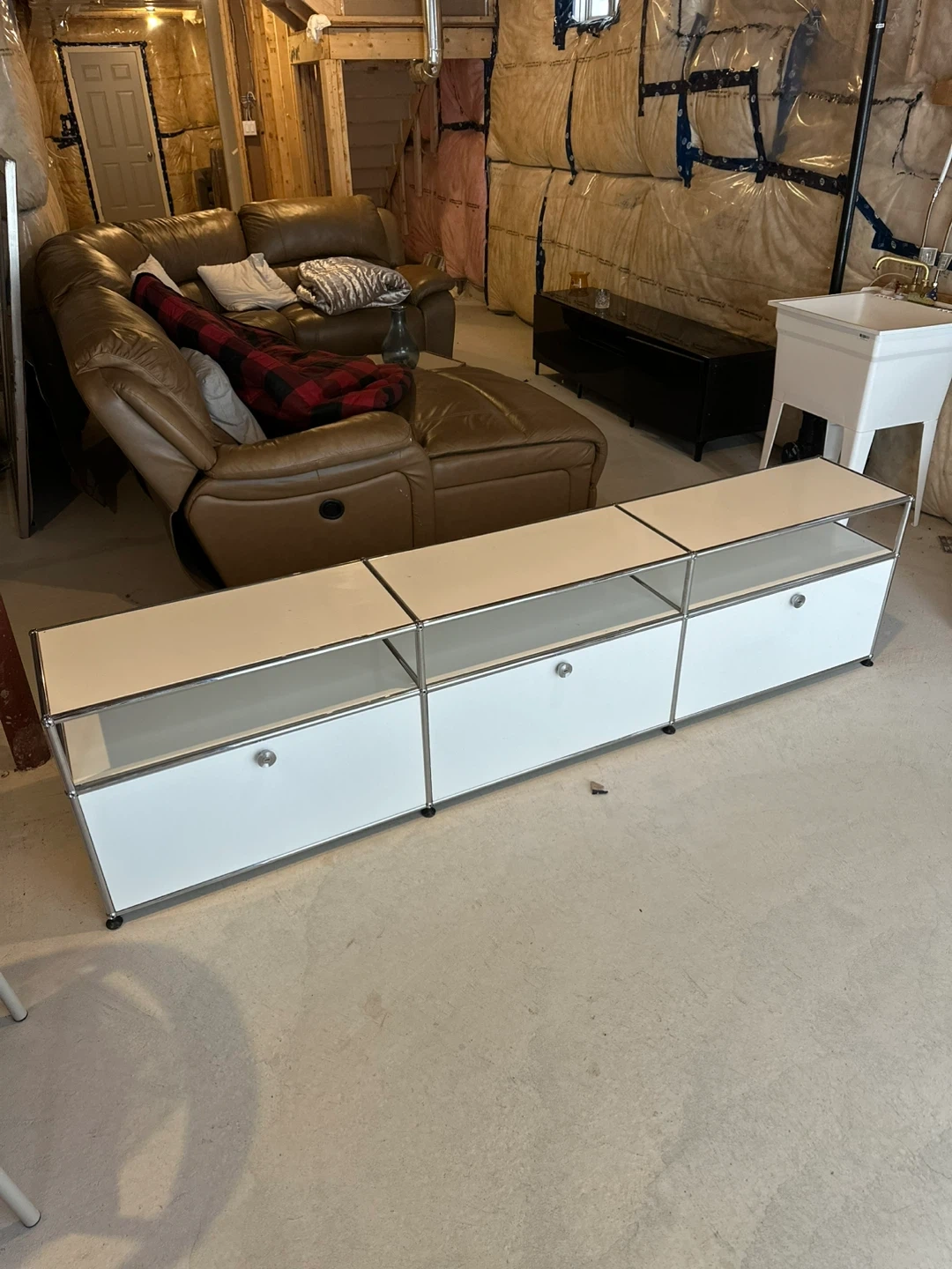 Selling a USM Haller sideboard in white. It’s in great condition and ready for a new home! This stylish and versatile piece is perfect for any living room or office space. It features clean lines and a modular design, offering ample storage with its drawers.