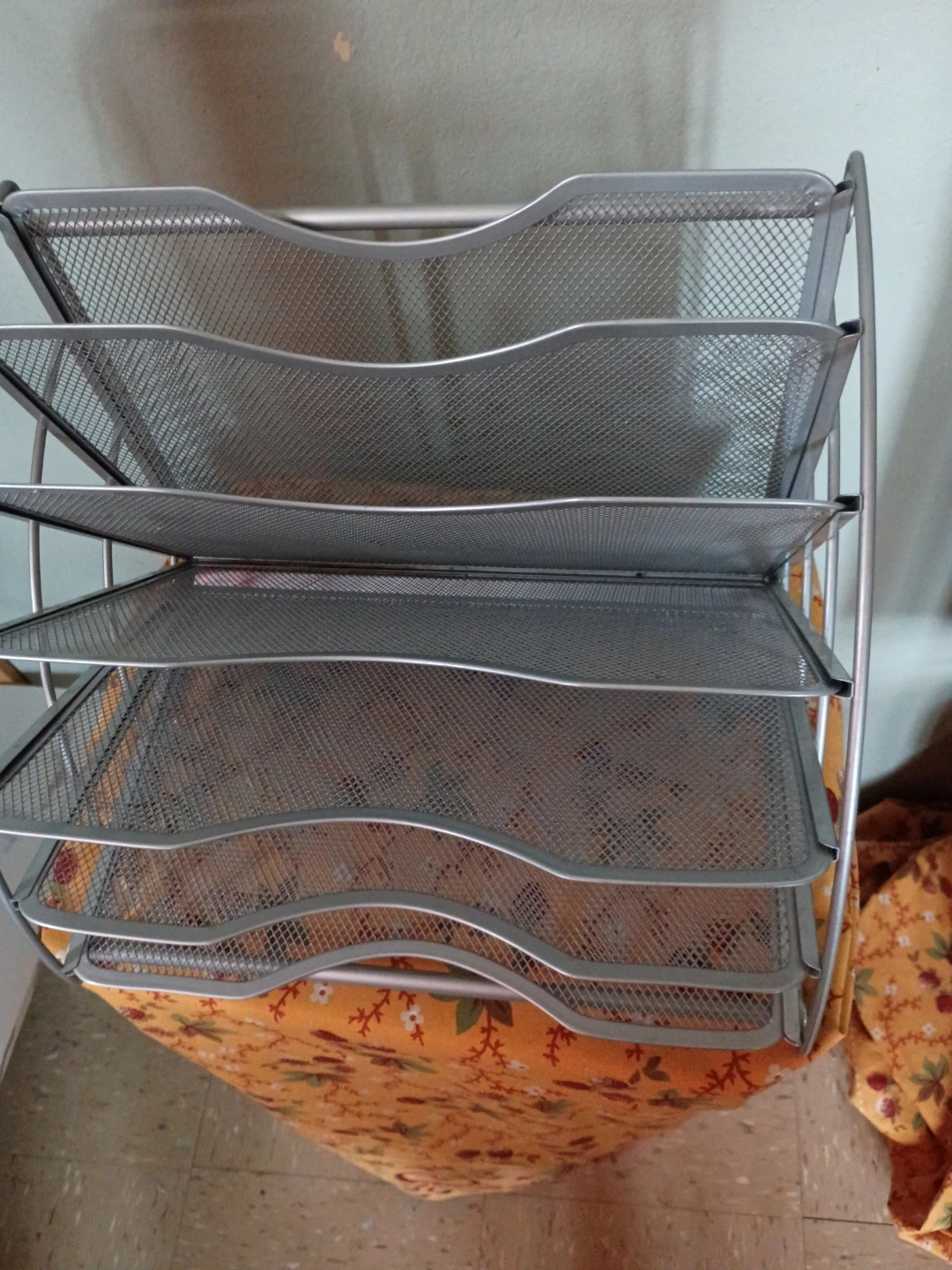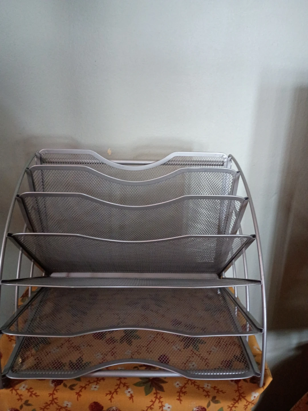 Selling a silver metal mesh file organizer with 5 tiers. It's perfect for keeping your documents and papers neatly organized. It has a sturdy construction and a sleek design that will look great in any office or home workspace