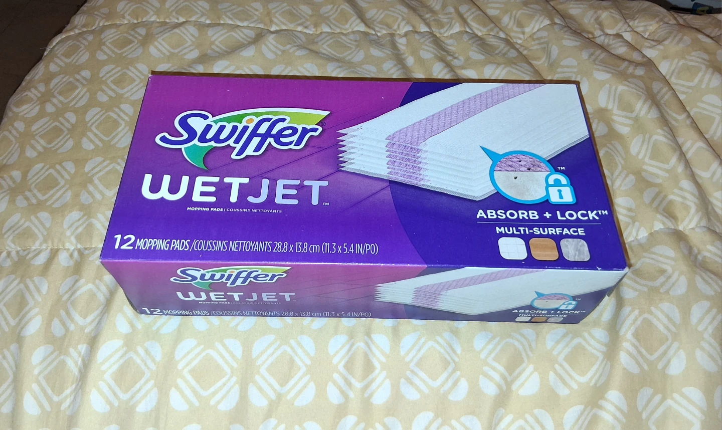 I have a box of Swiffer WetJet mopping pad refills for sale. The box contains 12 mopping pads, each measuring 28.8 x 13.8 cm (11.3 x 5.4 in). These pads feature absorb + lock technology and are suitable for multi-surface use.