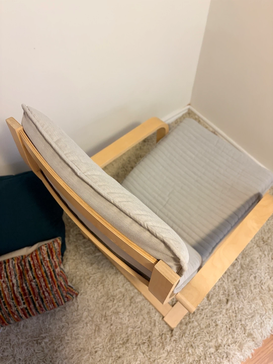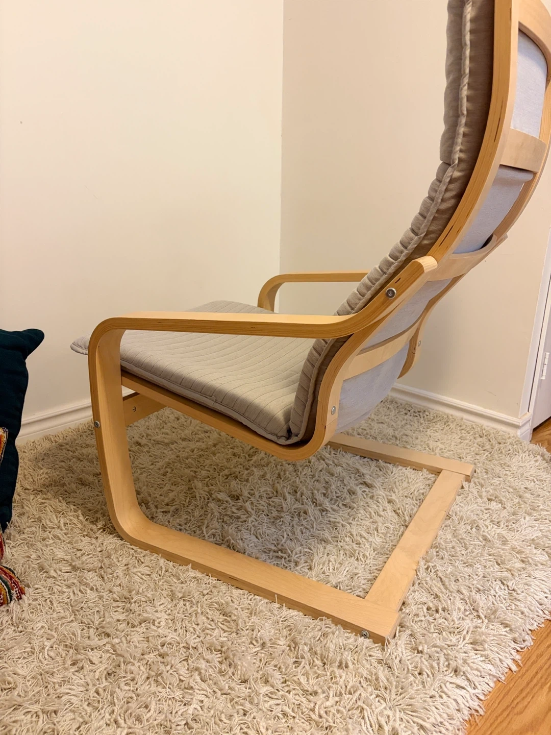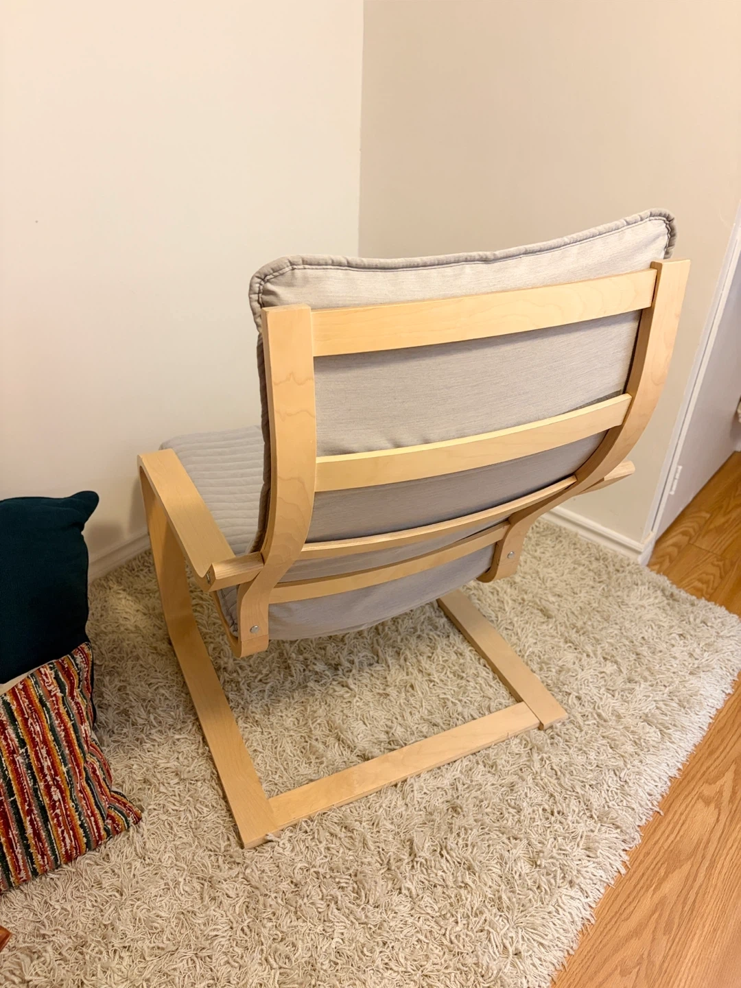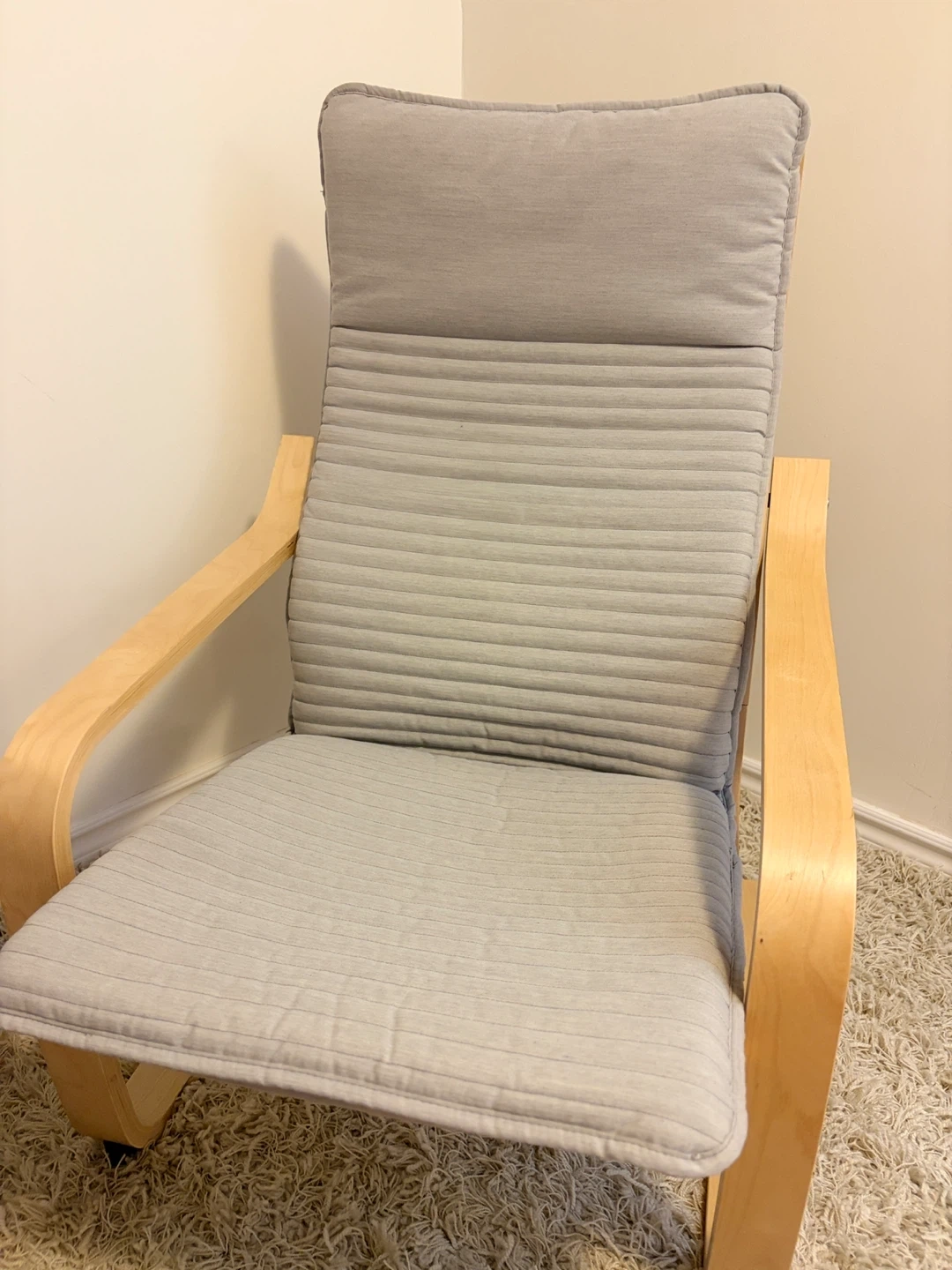 For sale is a Poang chair with a light wood frame and a neutral grey cushion.