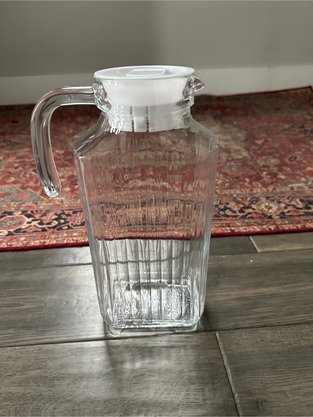 Selling a clear glass pitcher with a white lid. It's in great shape and ready to hold your favourite beverages!
