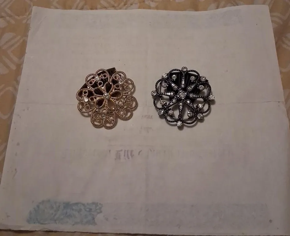 Selling two decorative hair clips! One is gold and the other is a dark colour, both with a floral design and rhinestones. They're perfect for adding a touch of sparkle to any hairstyle.