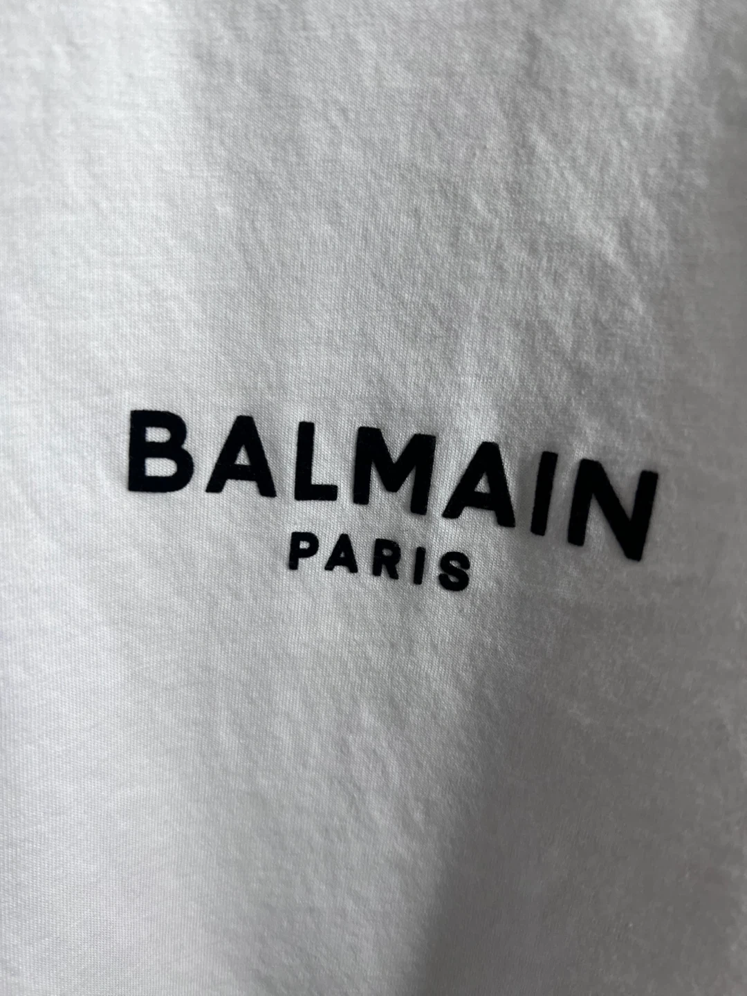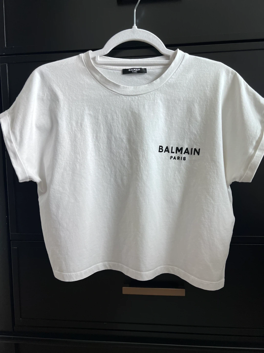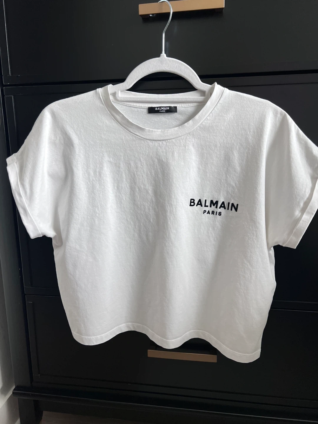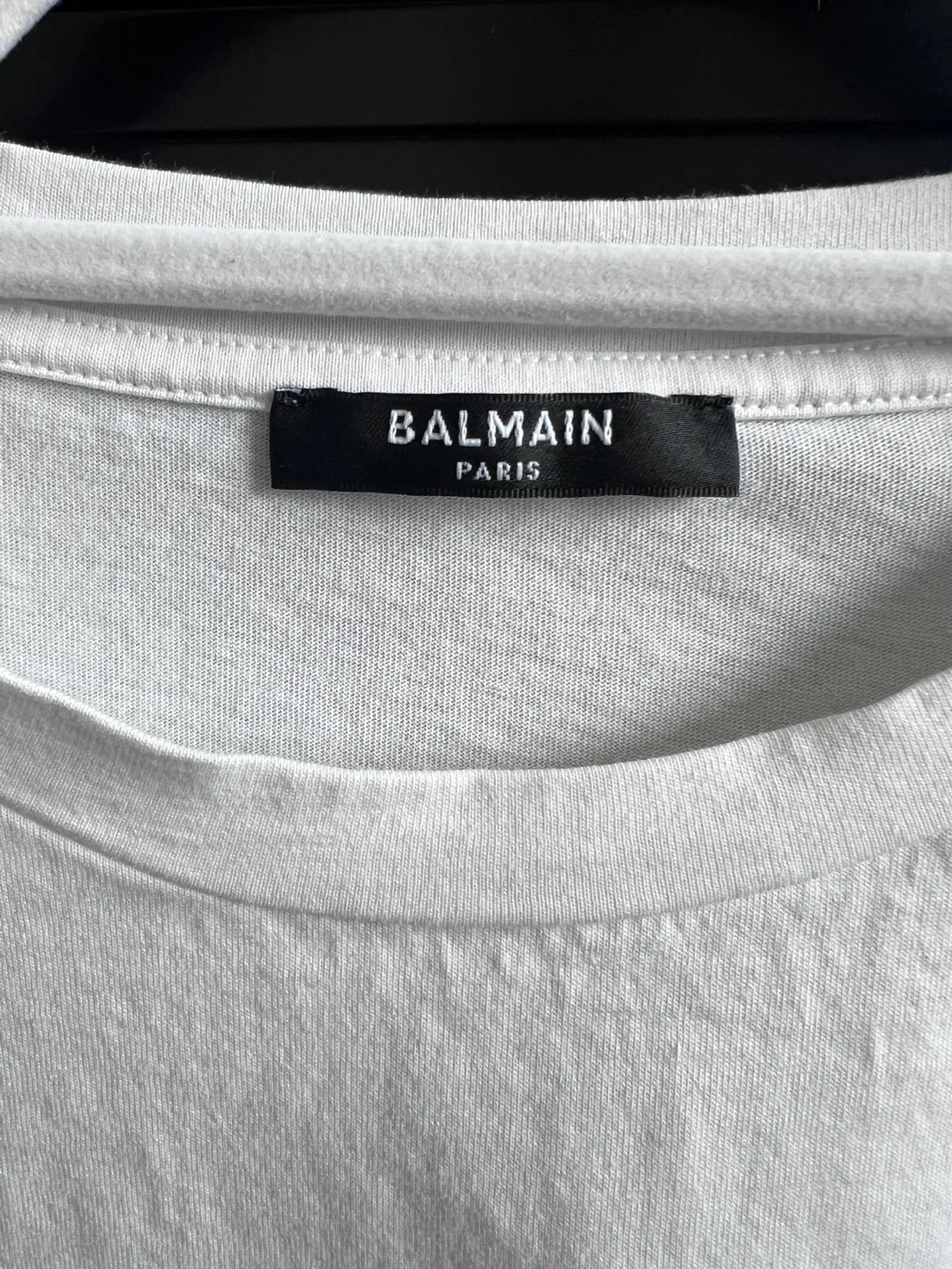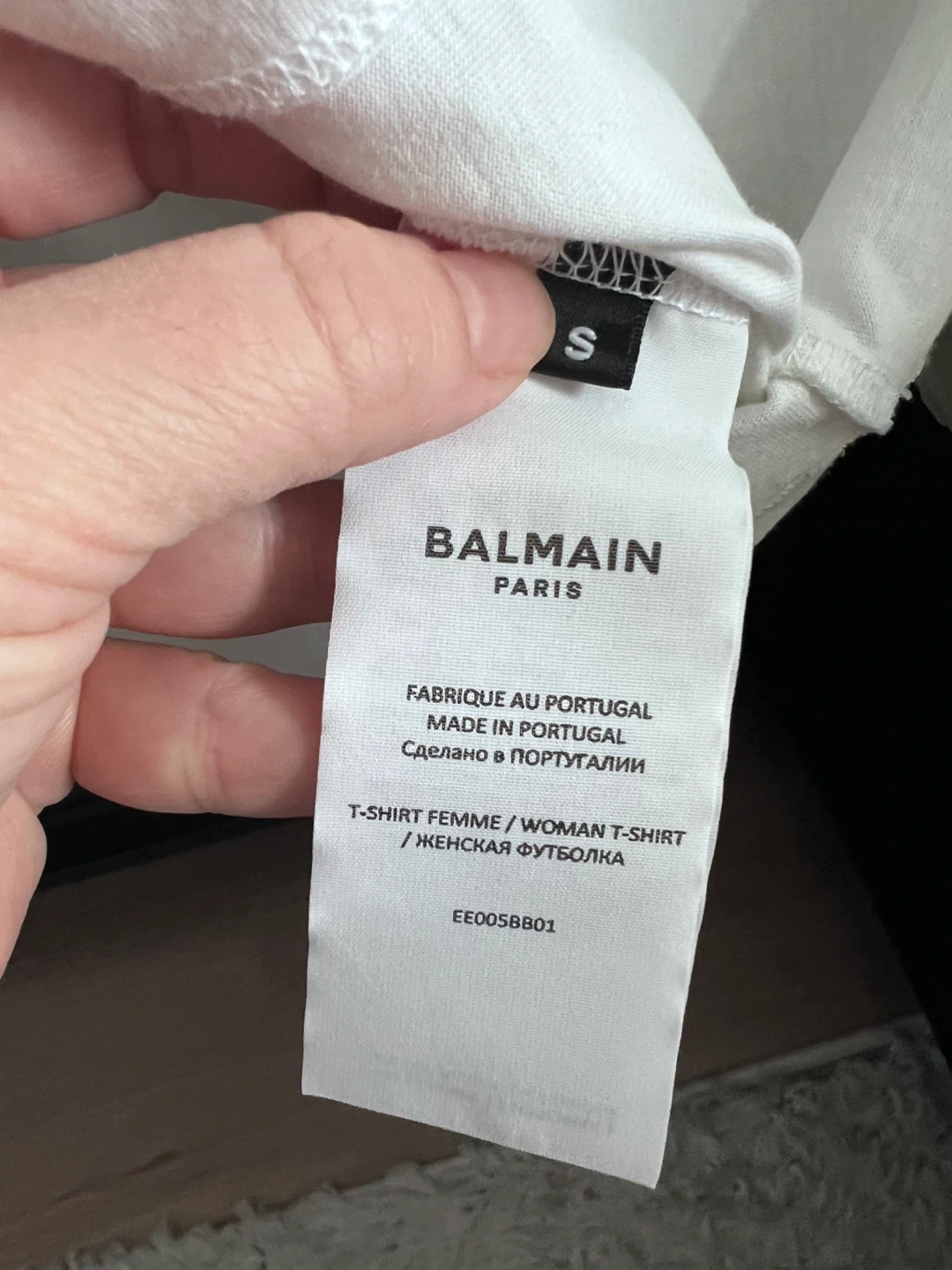 Selling a Balmain Paris white T-shirt in size S. This stylish tee is made in Portugal and features the Balmain logo. It's a great addition to any wardrobe!