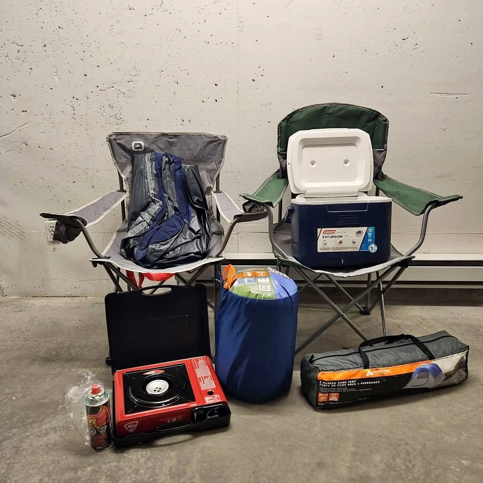 Full camping set (tent, mattress, cooler, sleeping bag...)