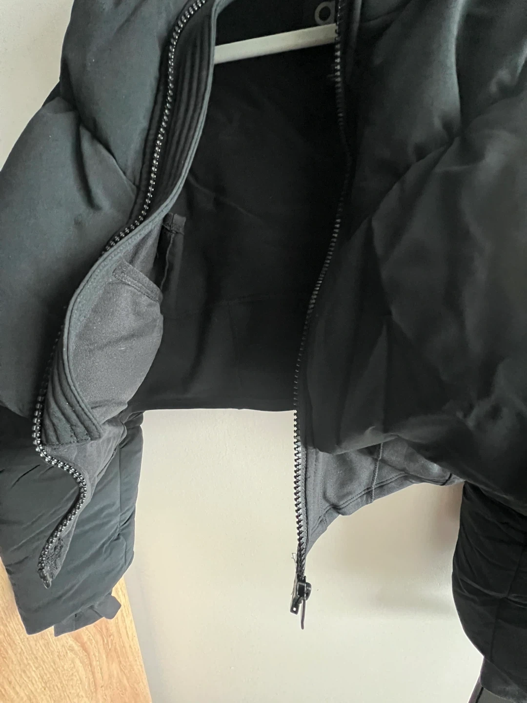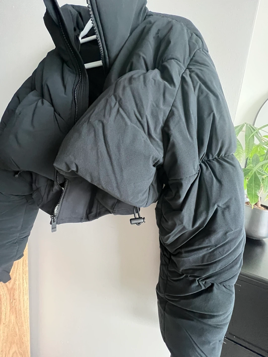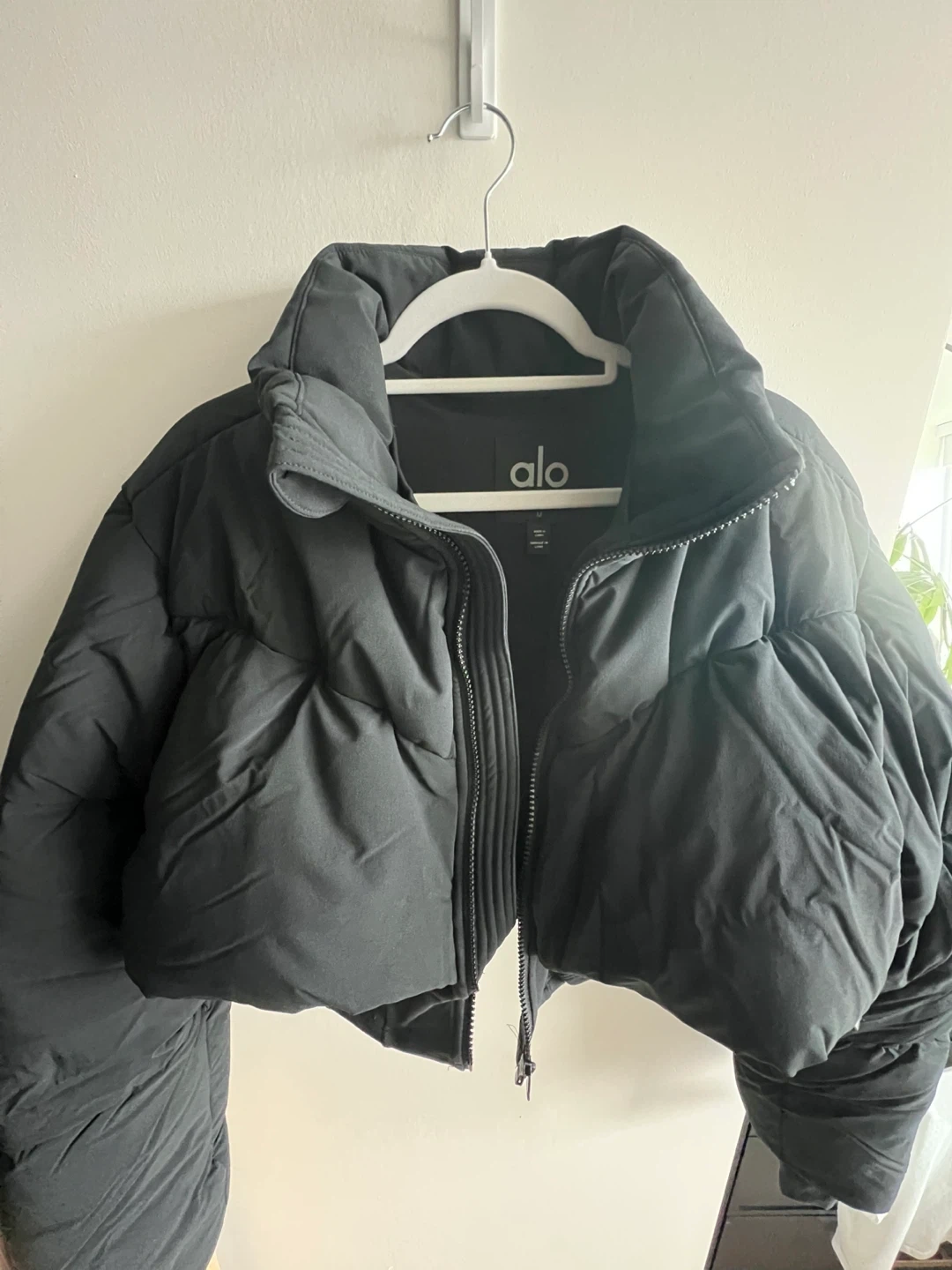 Selling a stylish black puffer jacket from ALO! It's in great condition and perfect for staying warm. The jacket features a cropped length and a comfortable fit. Size M (runs small so perfect for size S)