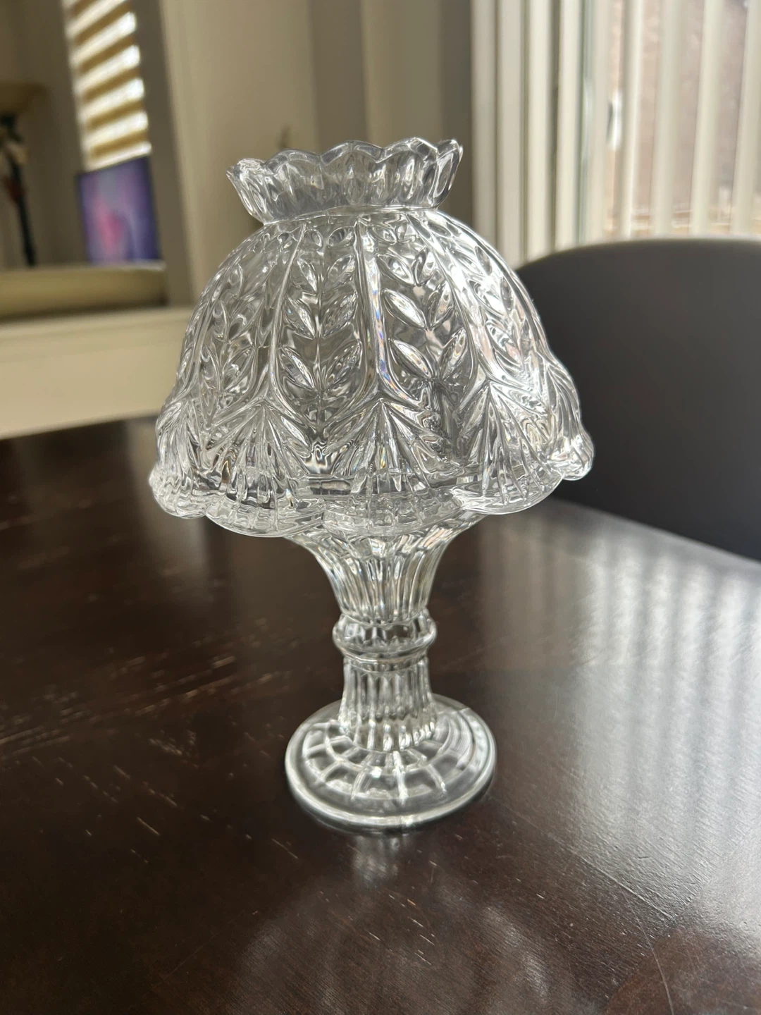 Selling a lovely vintage clear glass candle holder. It has a beautiful leaf pattern and a classic pedestal design. Perfect for adding a touch of elegance to any room!