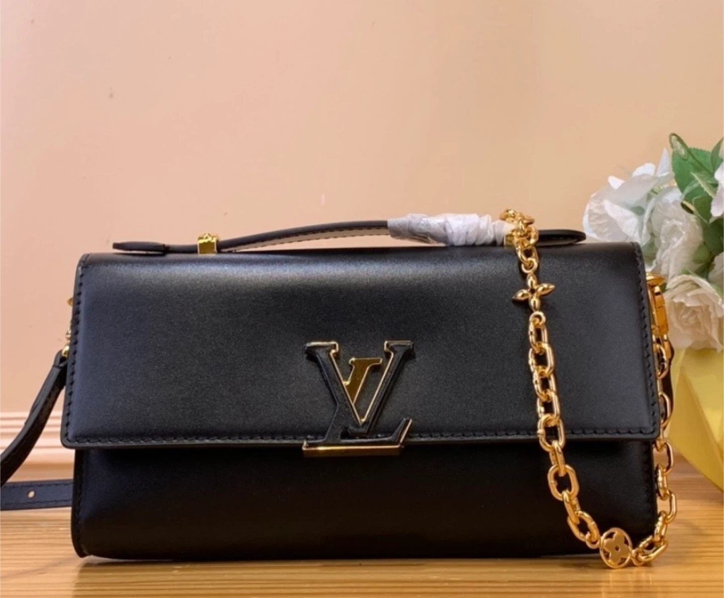 This is a beautiful Louis Vuitton handbag in black leather. It features the iconic LV logo in gold hardware and a gold chain. It's in great condition and ready for a new owner!