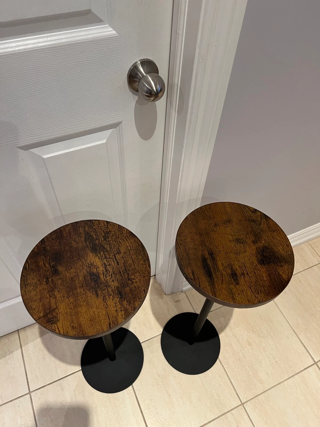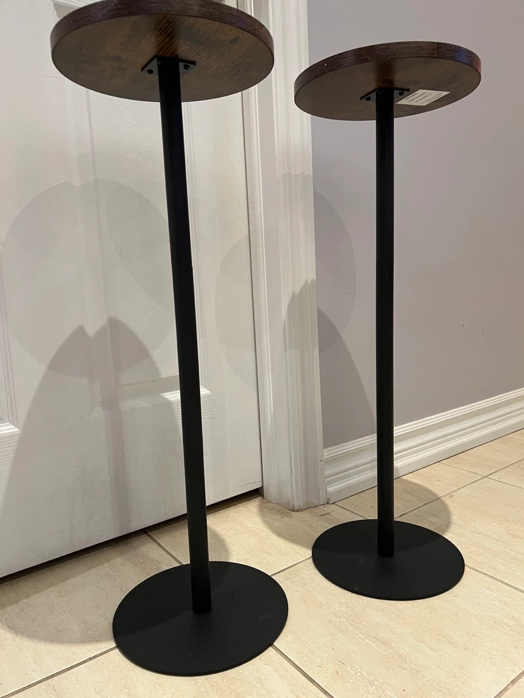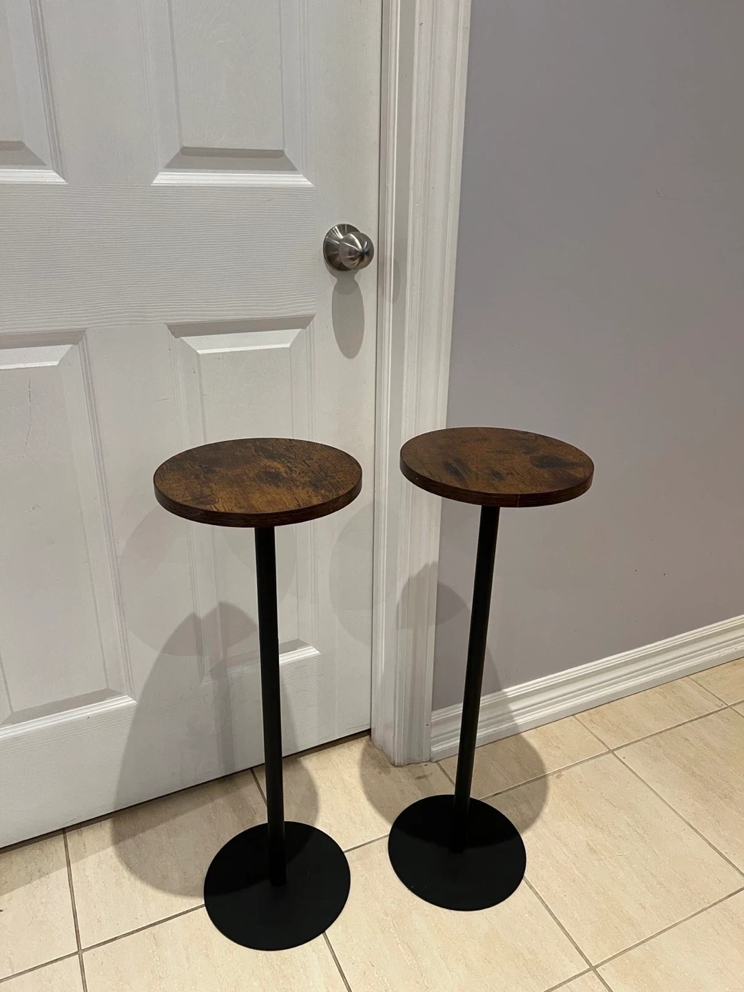 Selling a set of two accent tables! They feature a round, dark wood-look top and a sleek black metal base. They are about 28 inches tall and the table top is about 11 inches in diameter. These are perfect for adding a touch of modern style to any room!