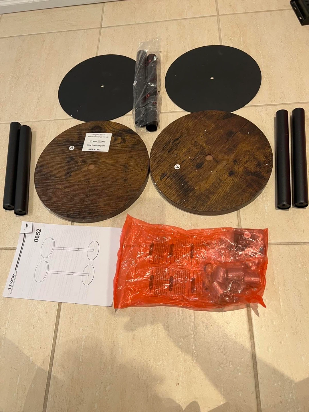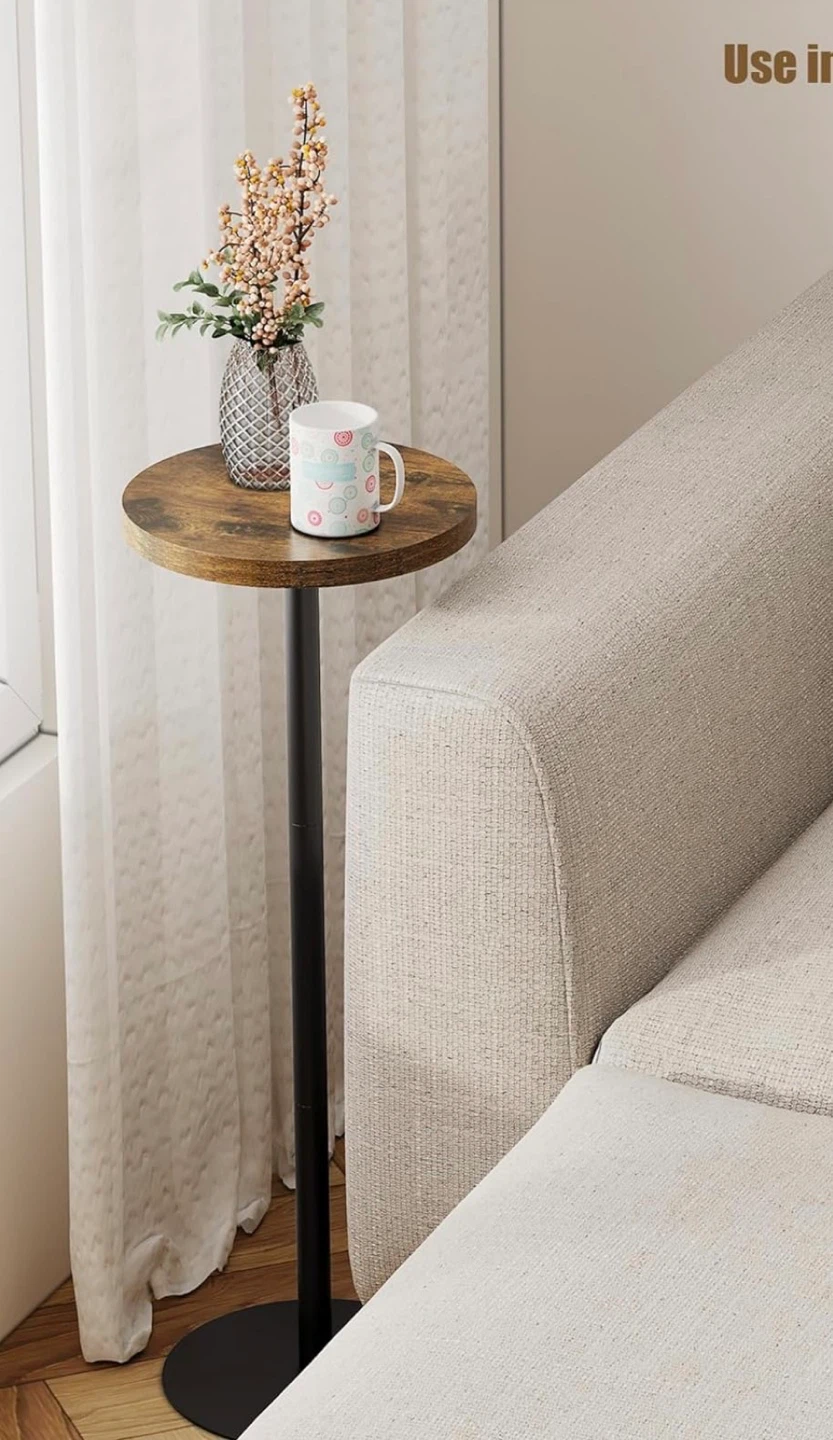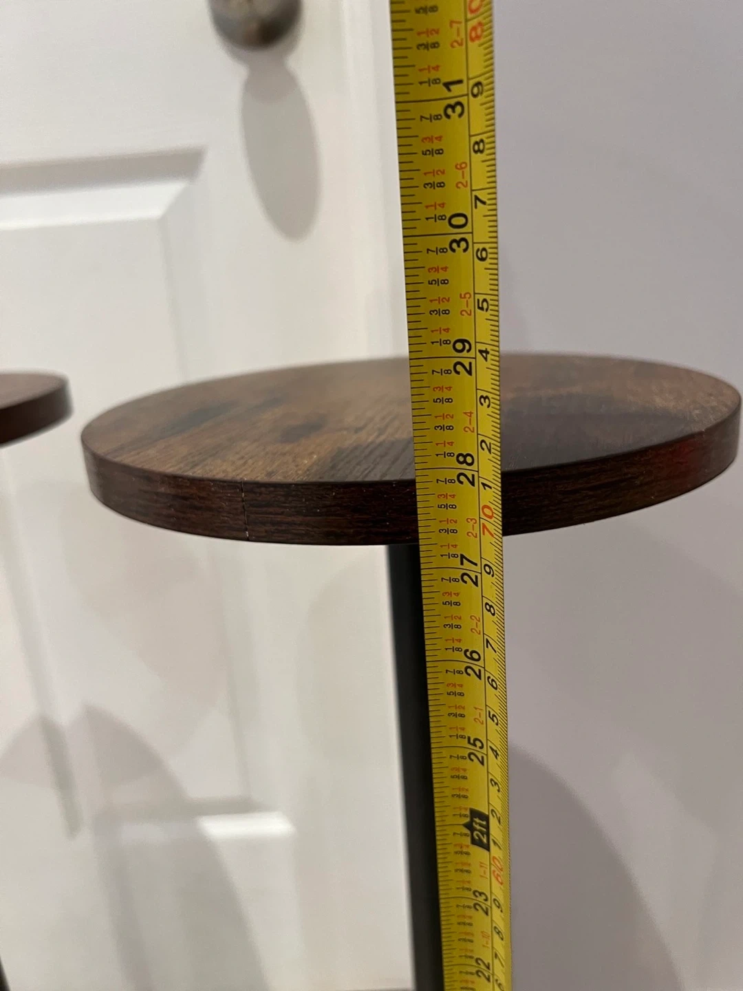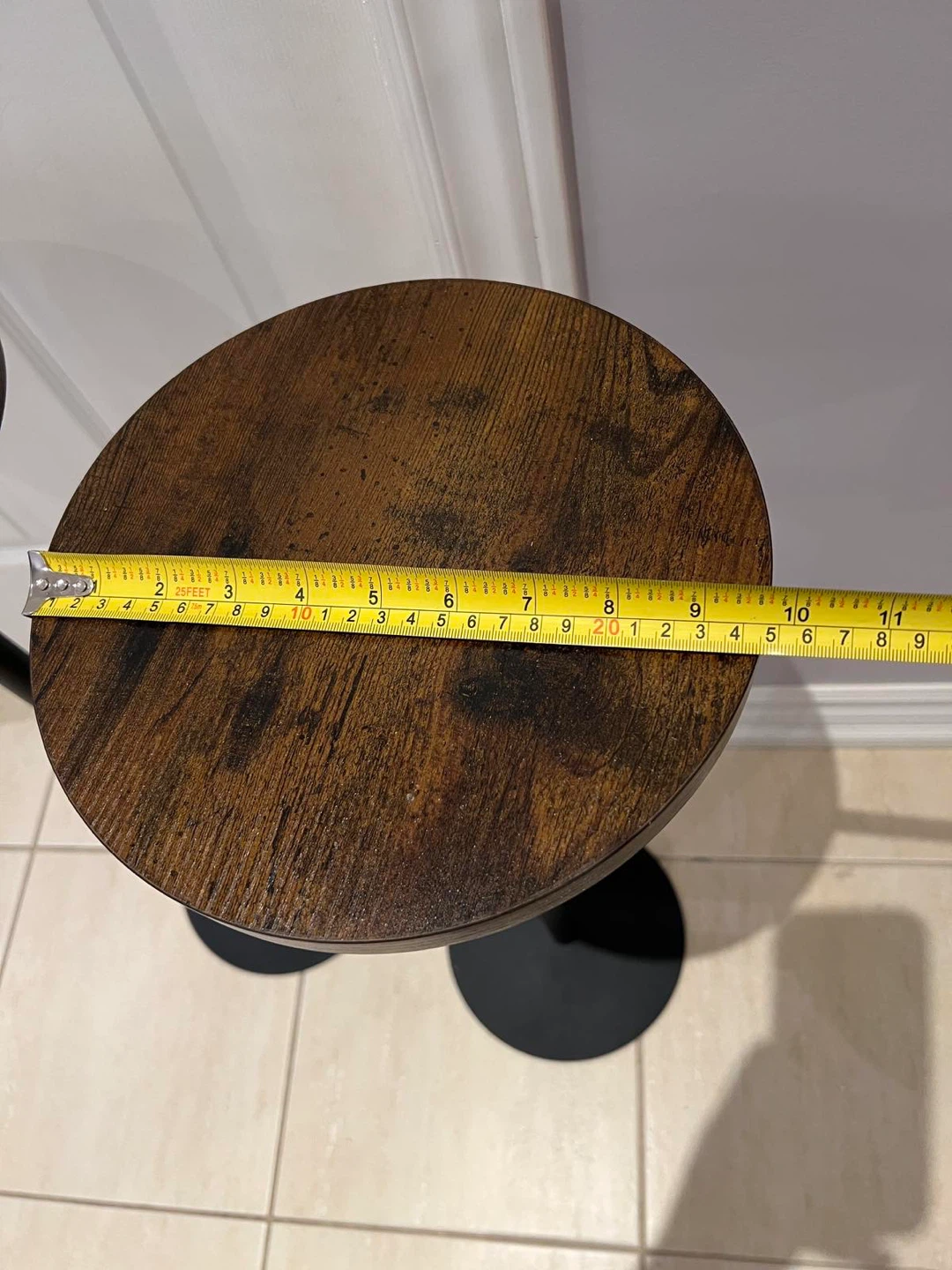 Selling a set of two accent tables! They feature a round, dark wood-look top and a sleek black metal base. They are about 28 inches tall and the table top is about 11 inches in diameter. These are perfect for adding a touch of modern style to any room!