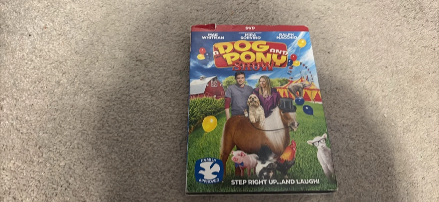 Selling a DVD of the movie Dog and Pony Show, starring Mae Whitman, Mira Sorvino, and Ralph Macchio. It's a family-approved movie, perfect for a lighthearted watch!