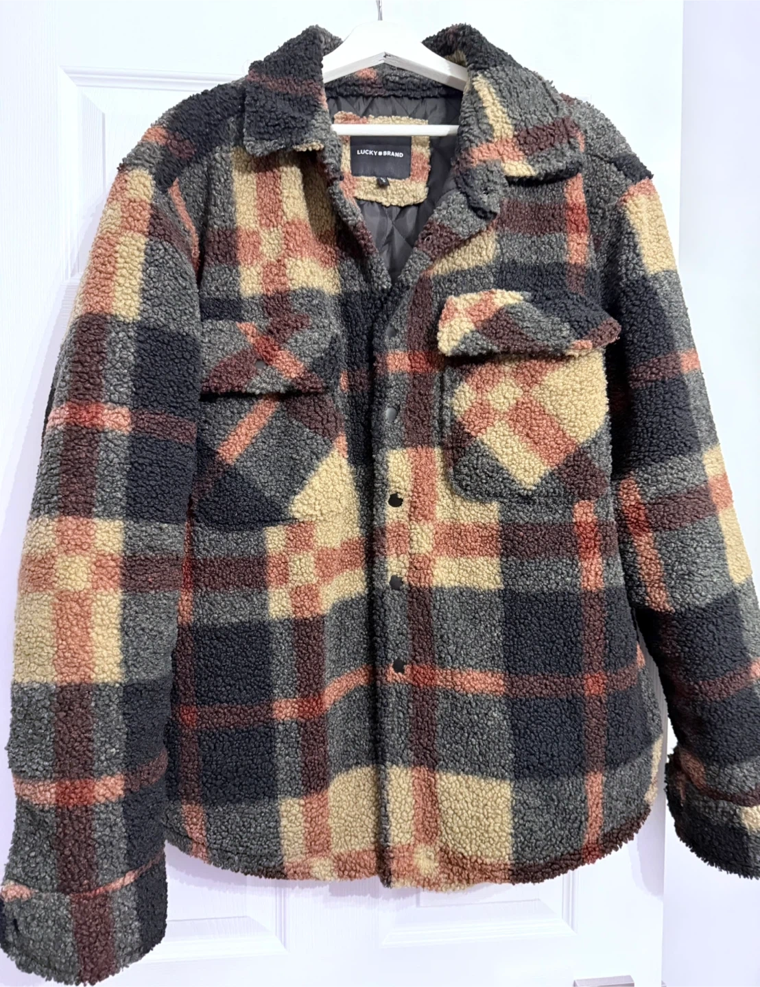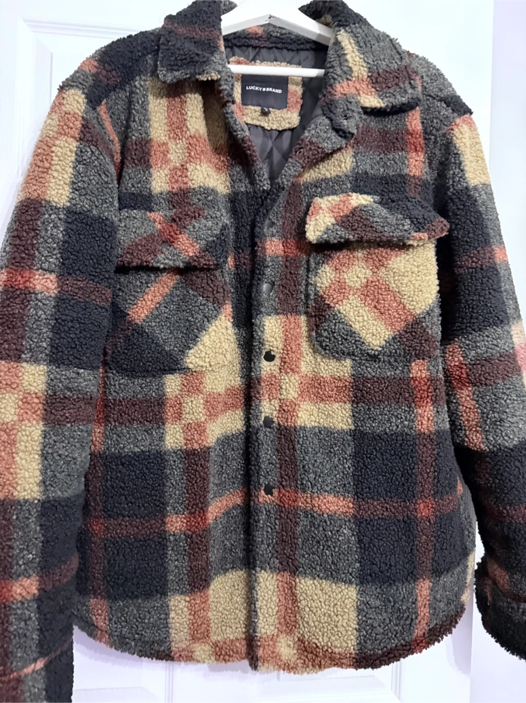 Cozy up with this Lucky Brand plaid fleece shirt jacket! It's in great condition and ready for those chilly days. The fleece material is super soft and comfortable, perfect for layering or wearing on its own.