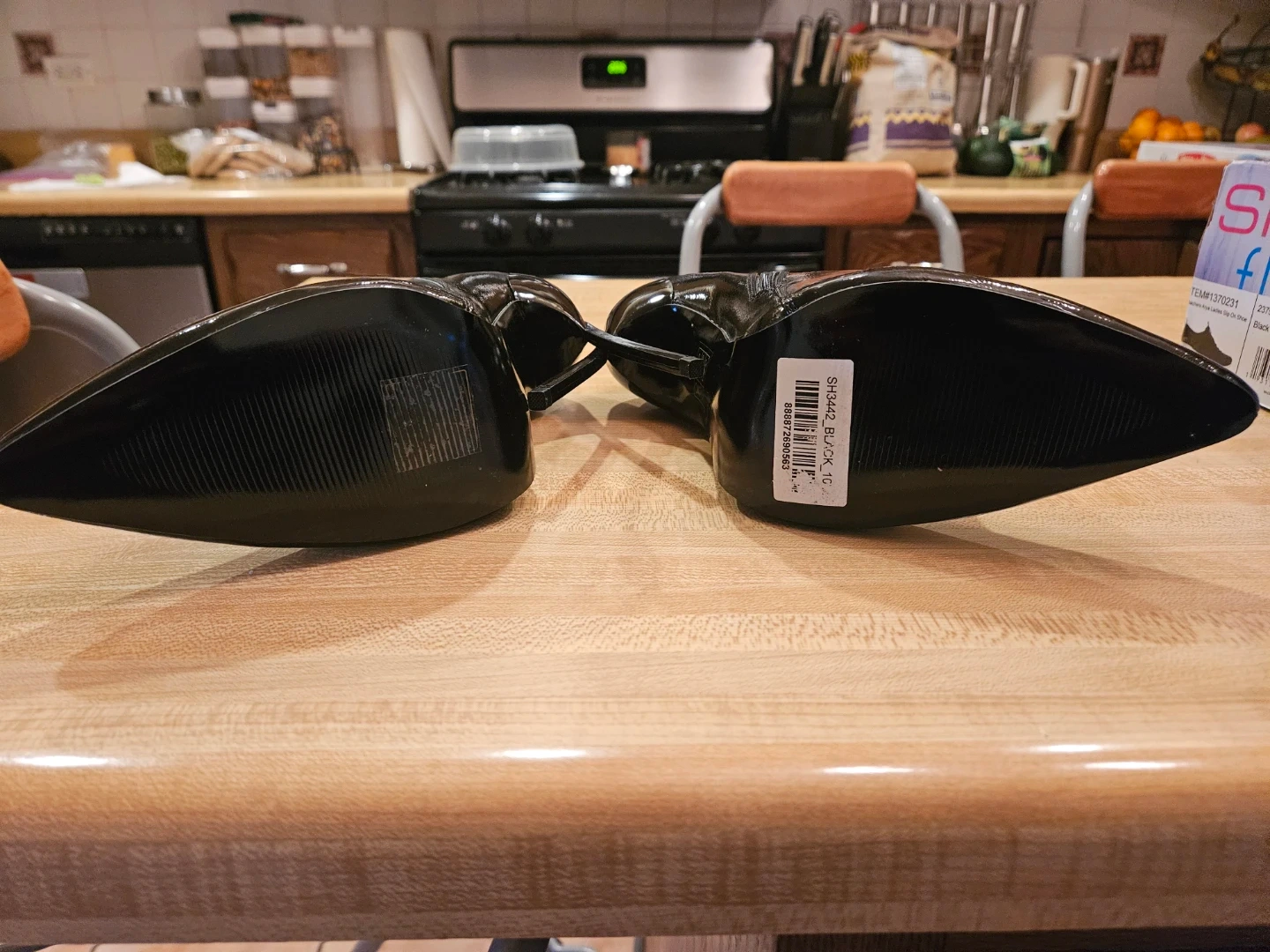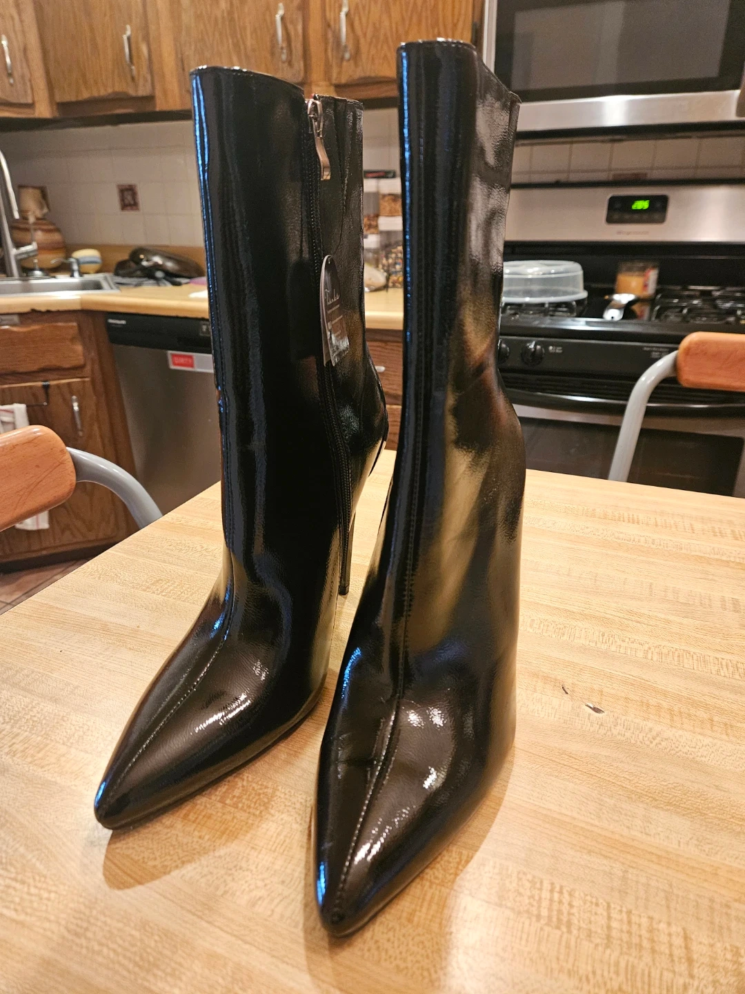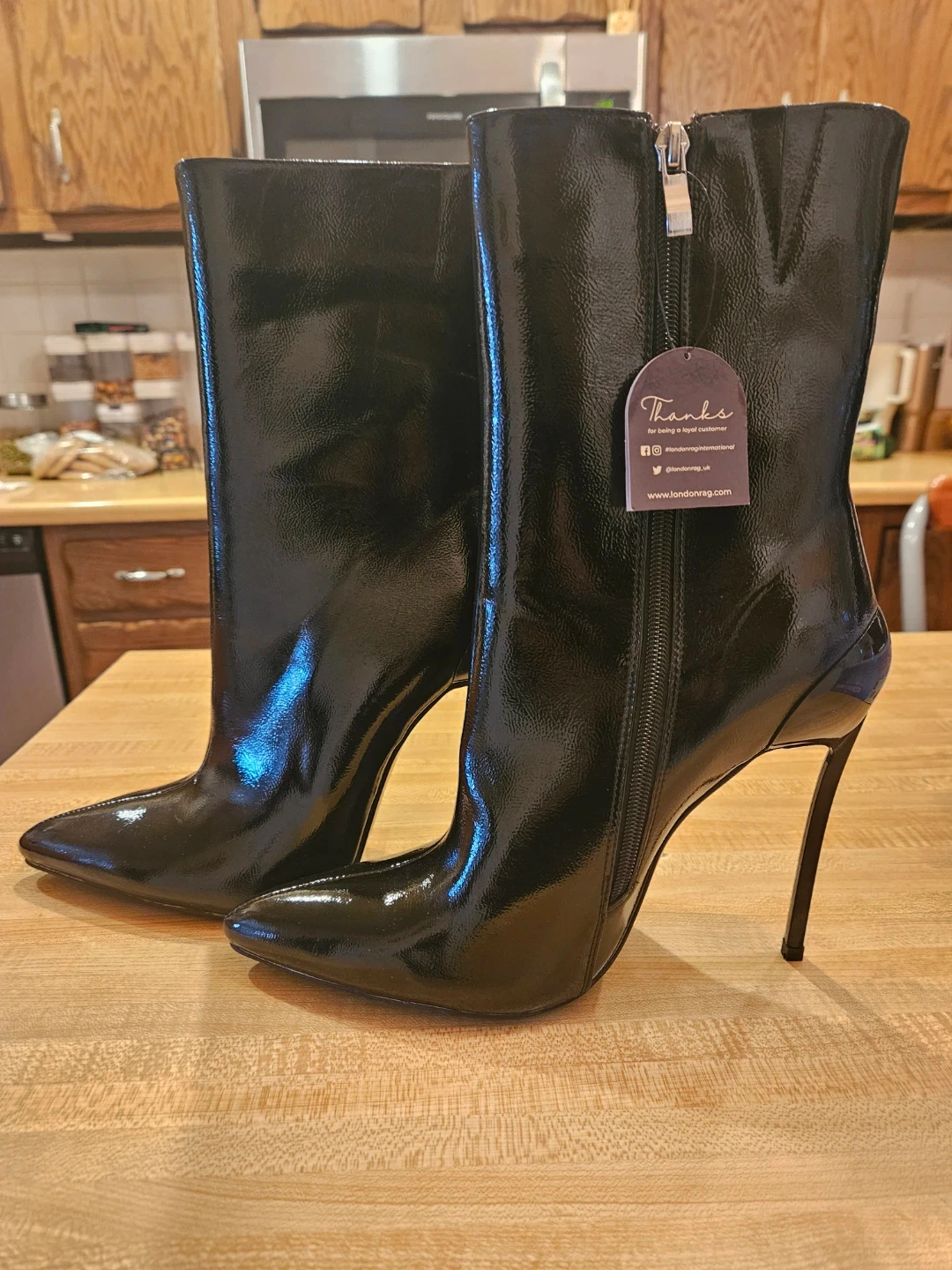 Selling a pair of London Rag black patent leather heeled boots. Size 10. These boots have a sleek and stylish look that is sure to turn heads. They are new.