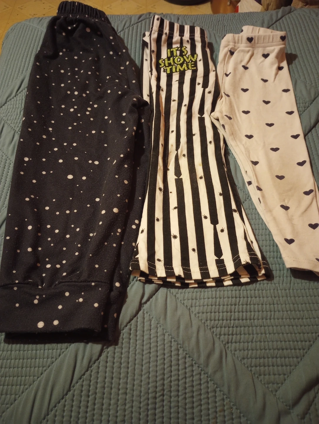 Selling a collection of kids' leggings in various fun patterns and colors! There's a mix of designs including unicorns, stars, stripes, polka dots, and hearts. Perfect for mixing and matching!