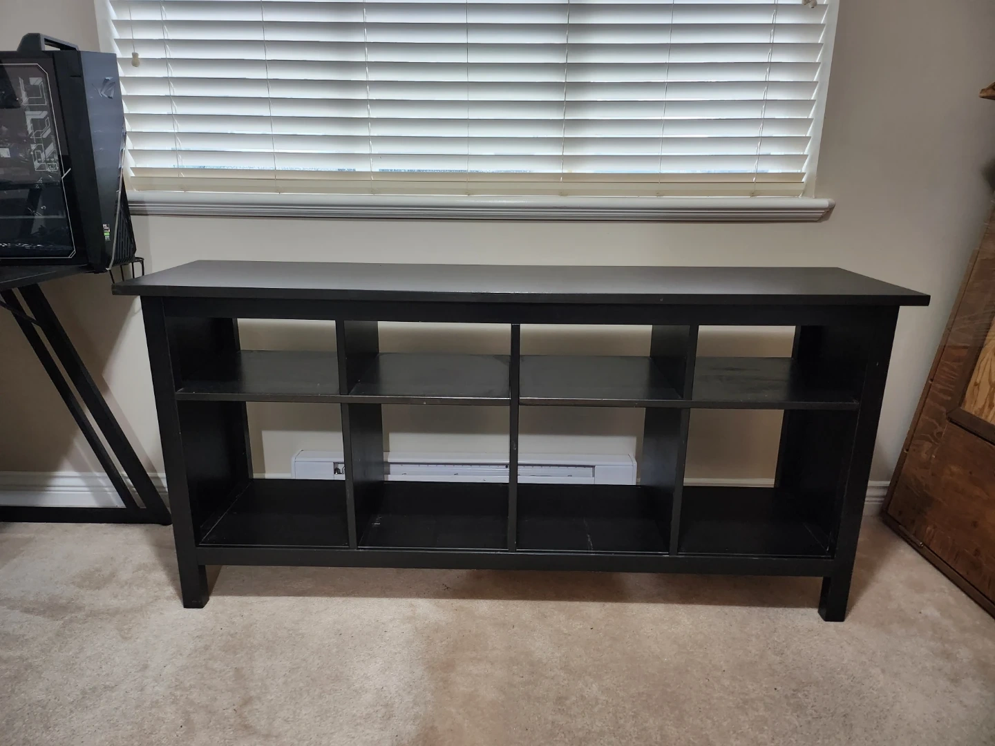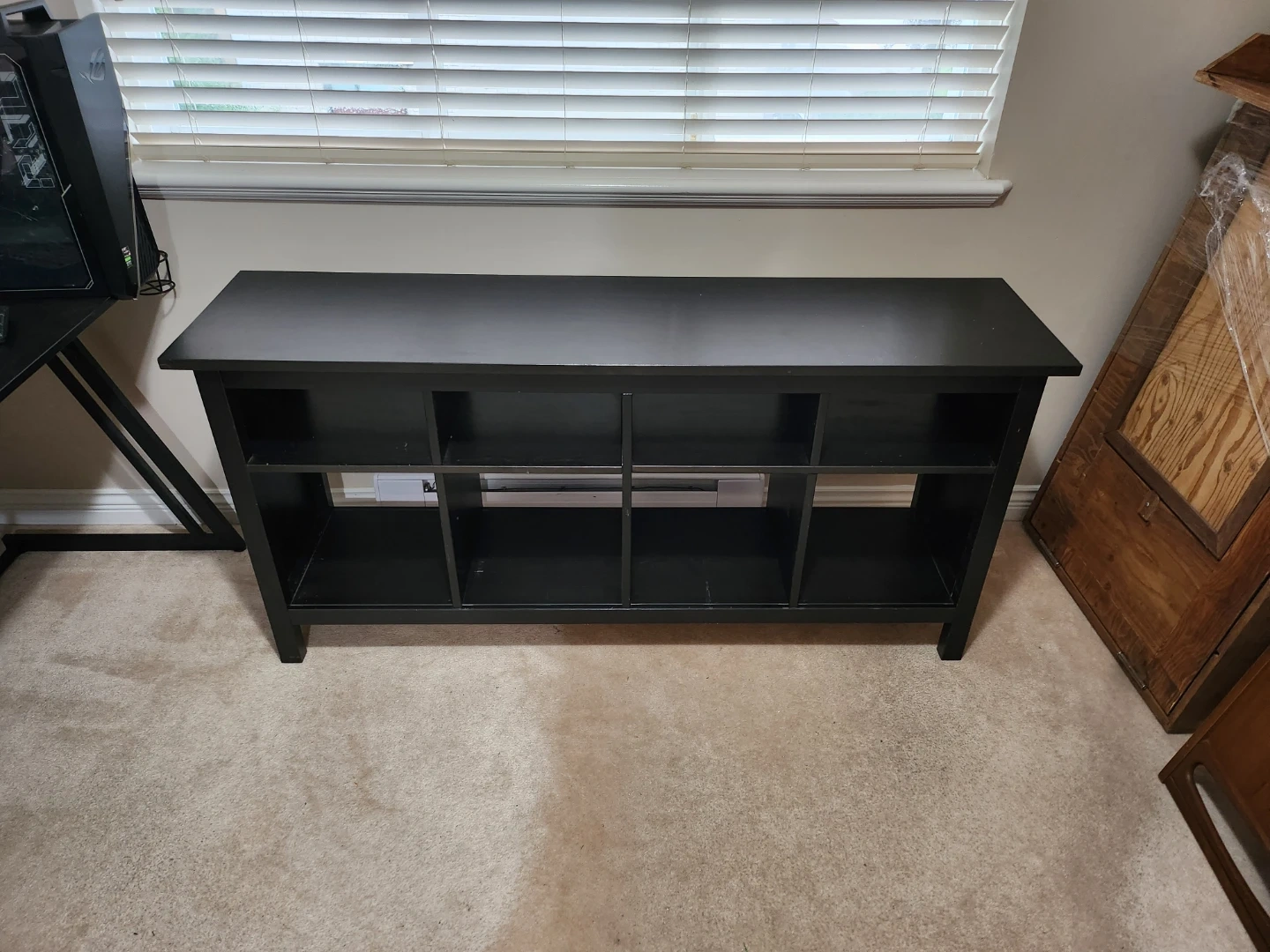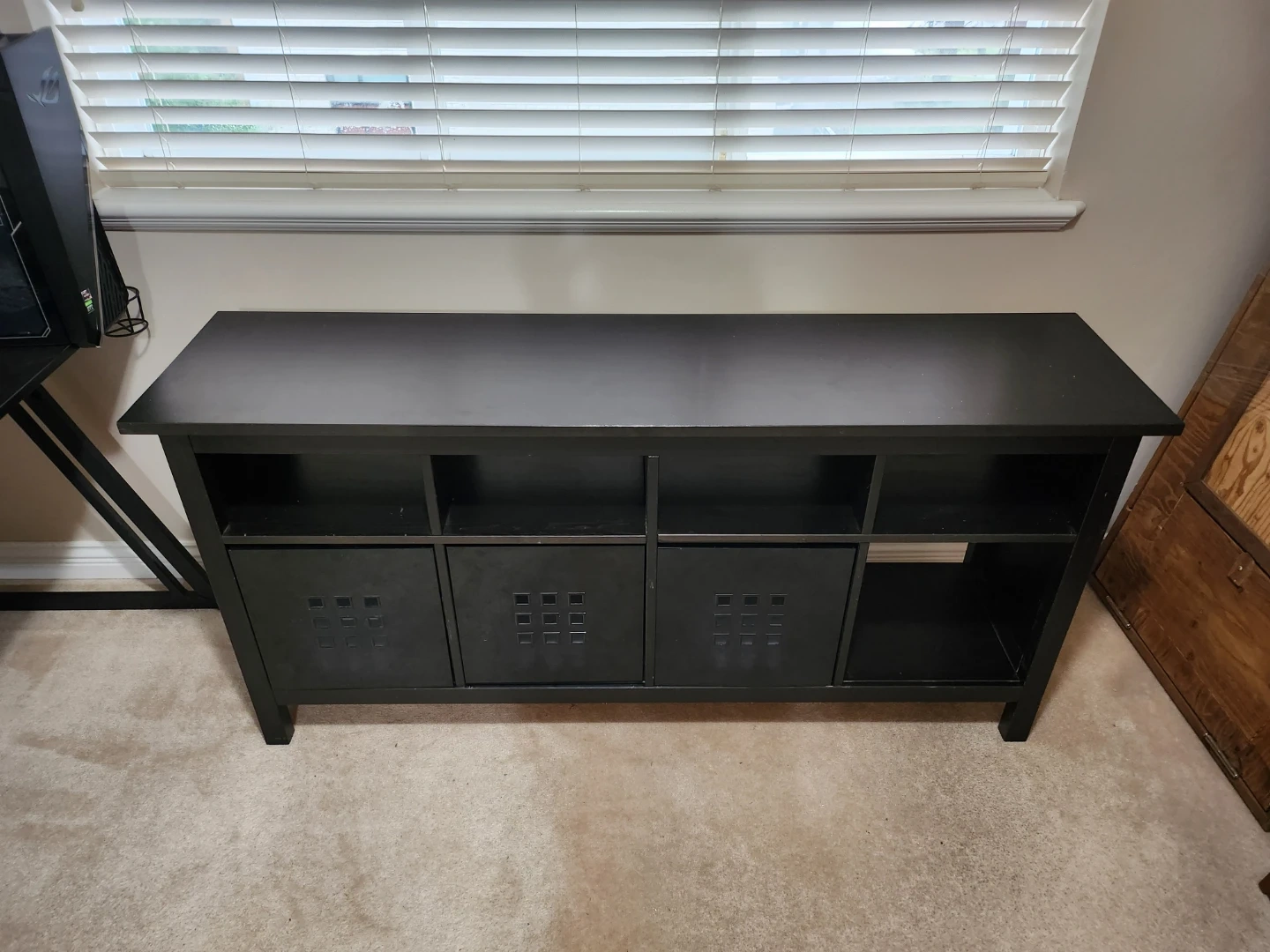 Selling a black media console, perfect as a TV stand or for extra storage. It's in great shape and ready for a new home. Has several compartments for organizing your media or other items