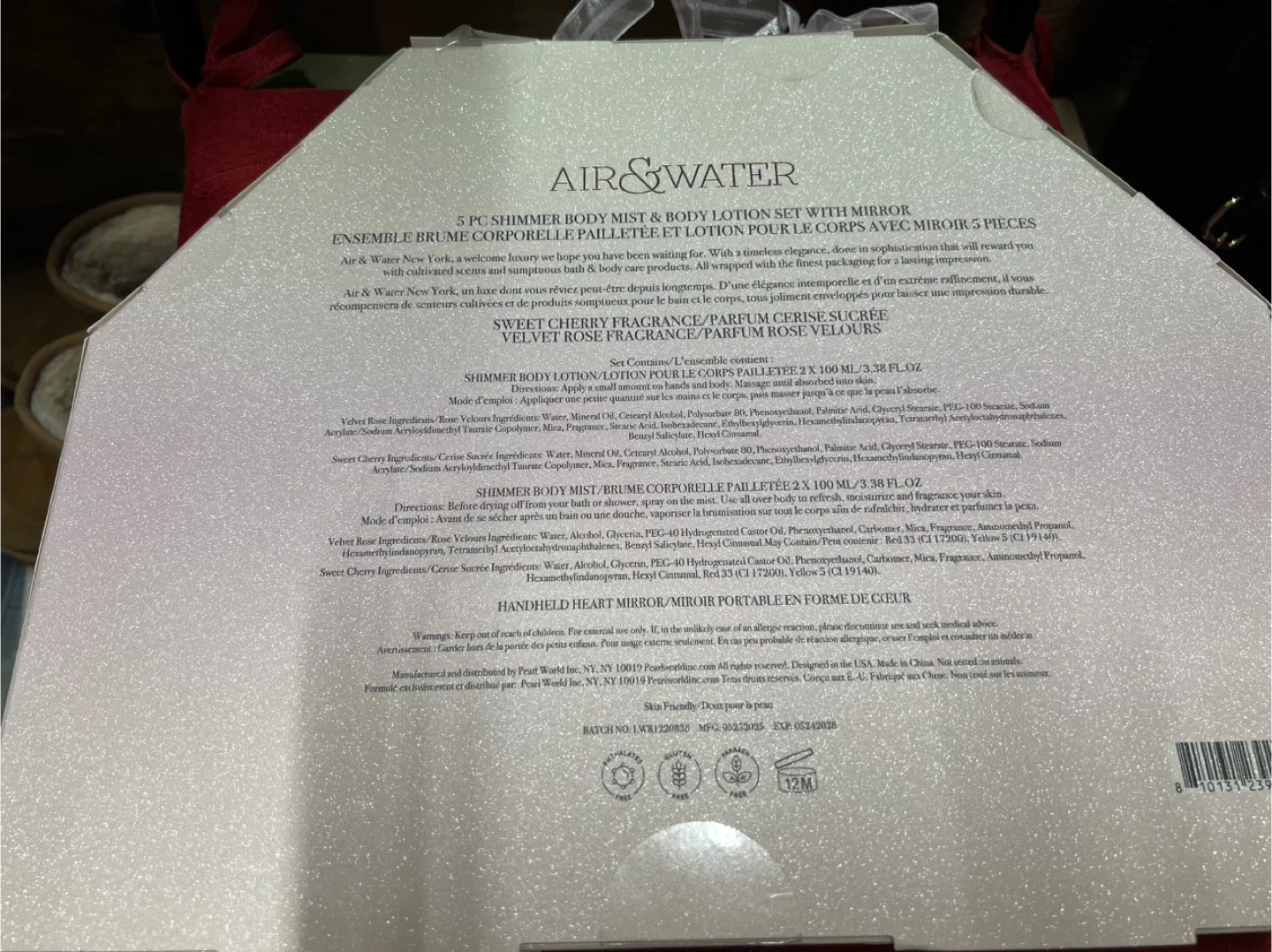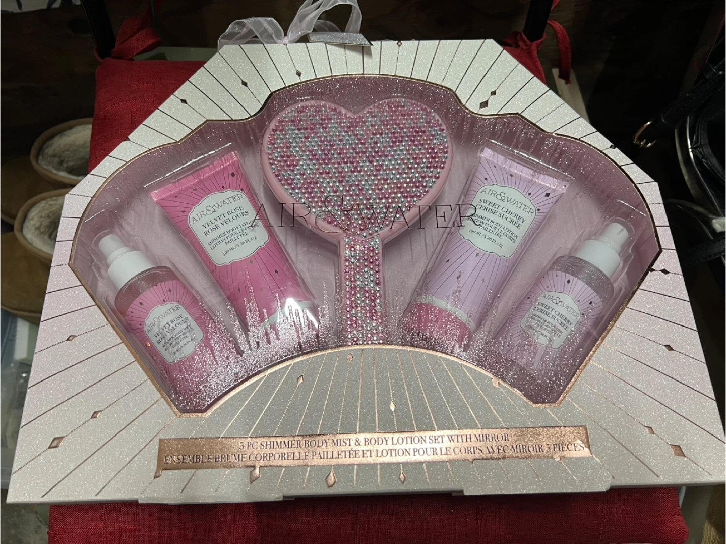 Selling a brand new Air & Water 5-piece shimmer body mist and body lotion set with a mirror! This set has a sweet cherry fragrance and a velvet rose fragrance. Perfect for adding a little sparkle to your day