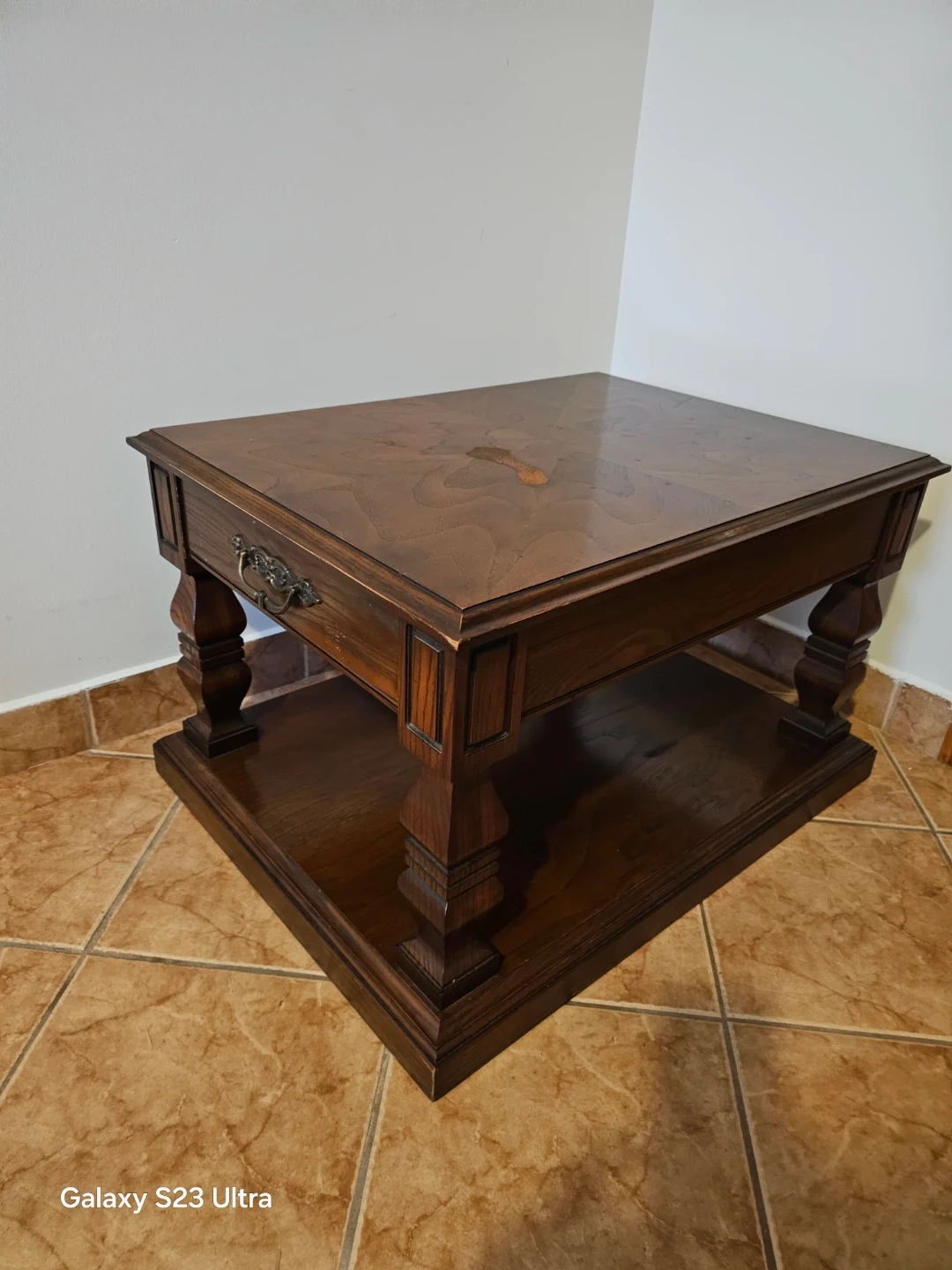 Selling a lovely wooden coffee table. It has a drawer for storage and a shelf at the bottom. It's in good condition and would look great in any living room!