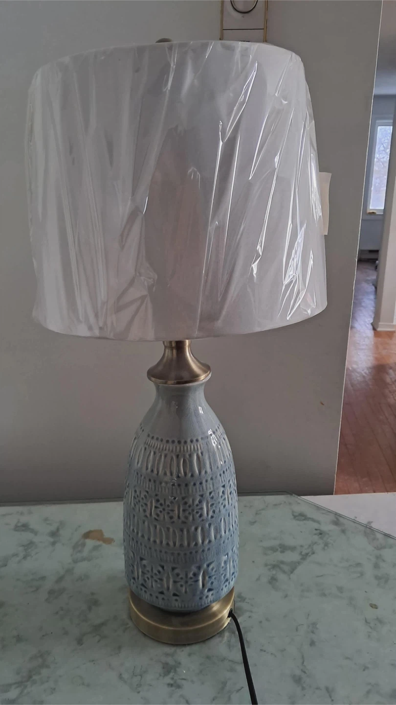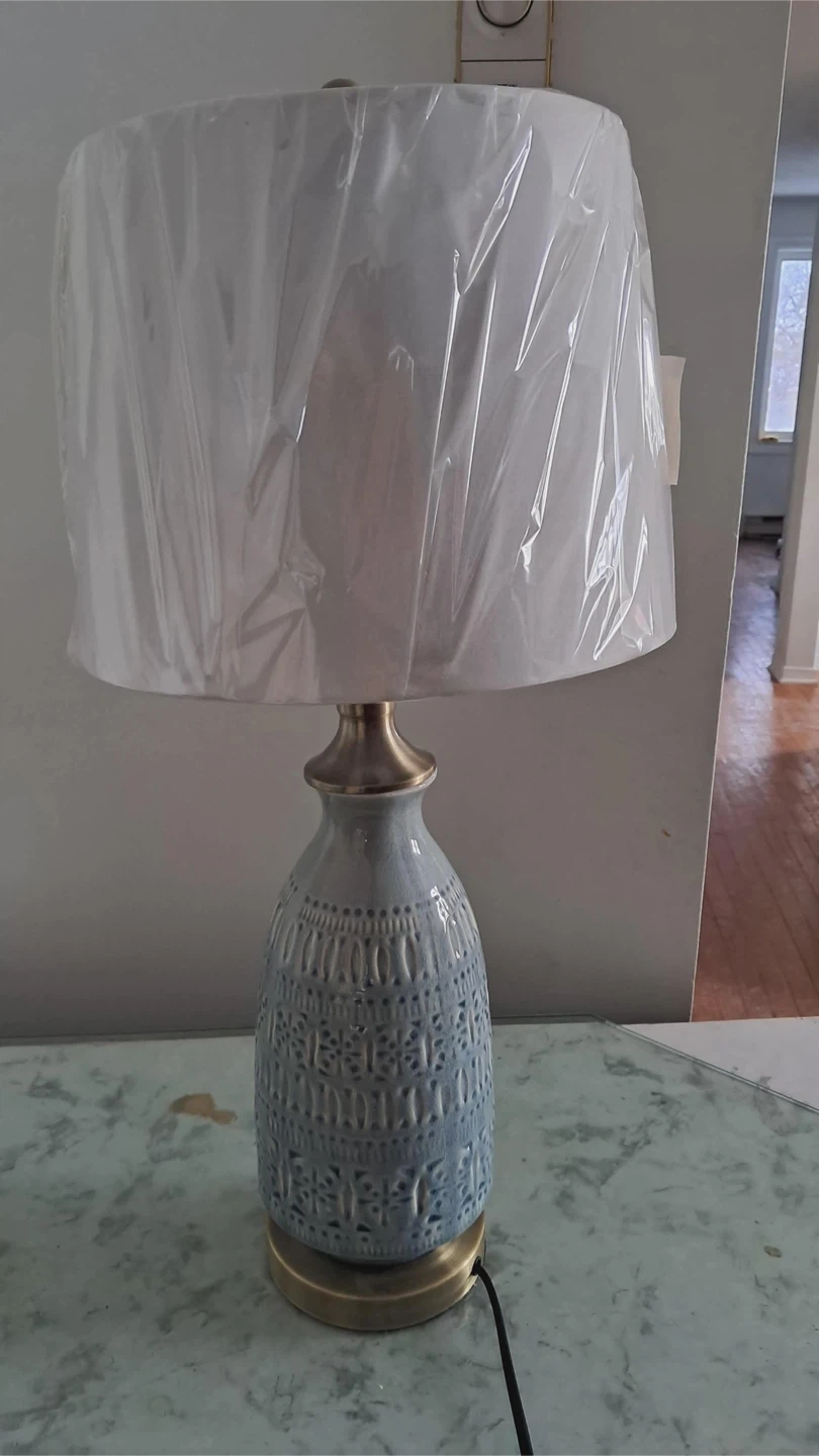 Here's a lovely table lamp with a unique blue patterned base! The shade is still covered in its original packaging, so it's basically brand new. It would be a great addition to any room!
