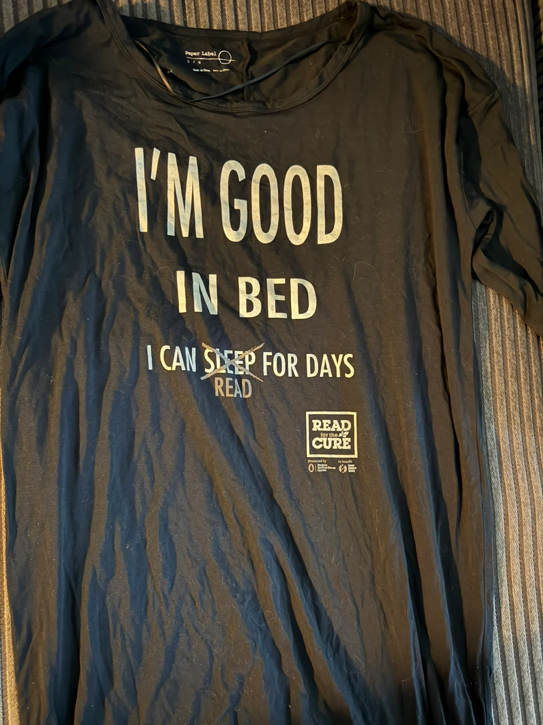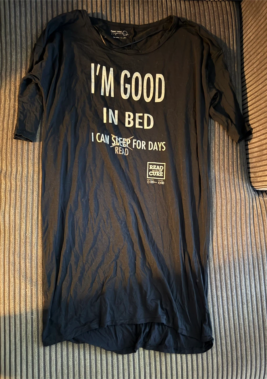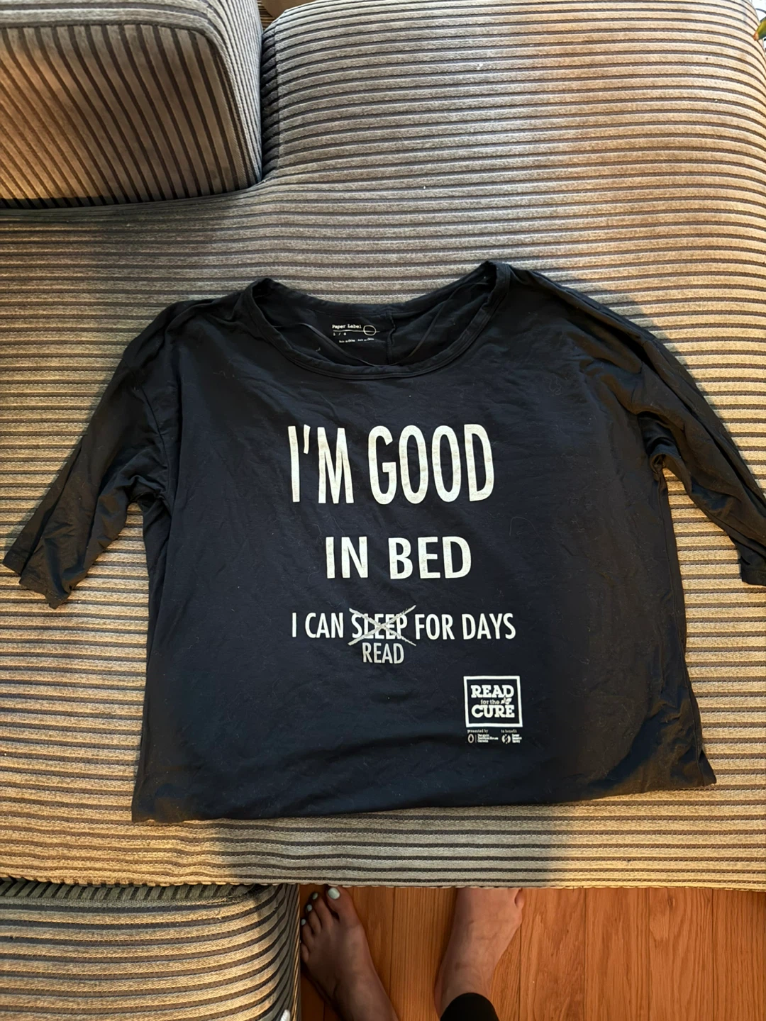 Paper Label black sleep shirt with "I'M GOOD IN BED" printed on the front.